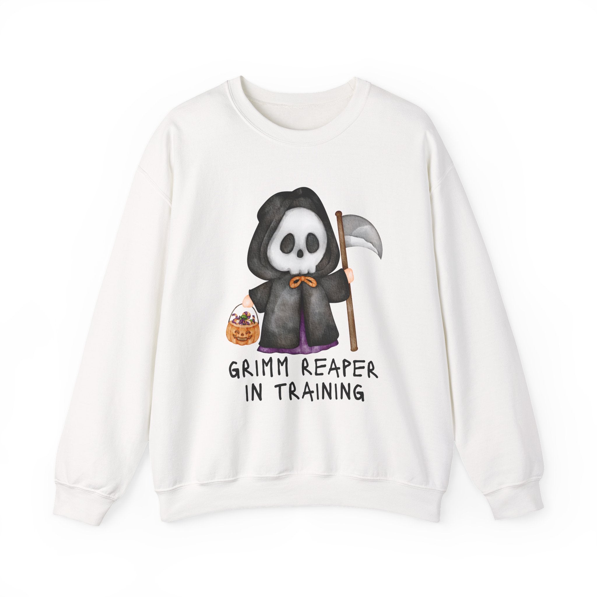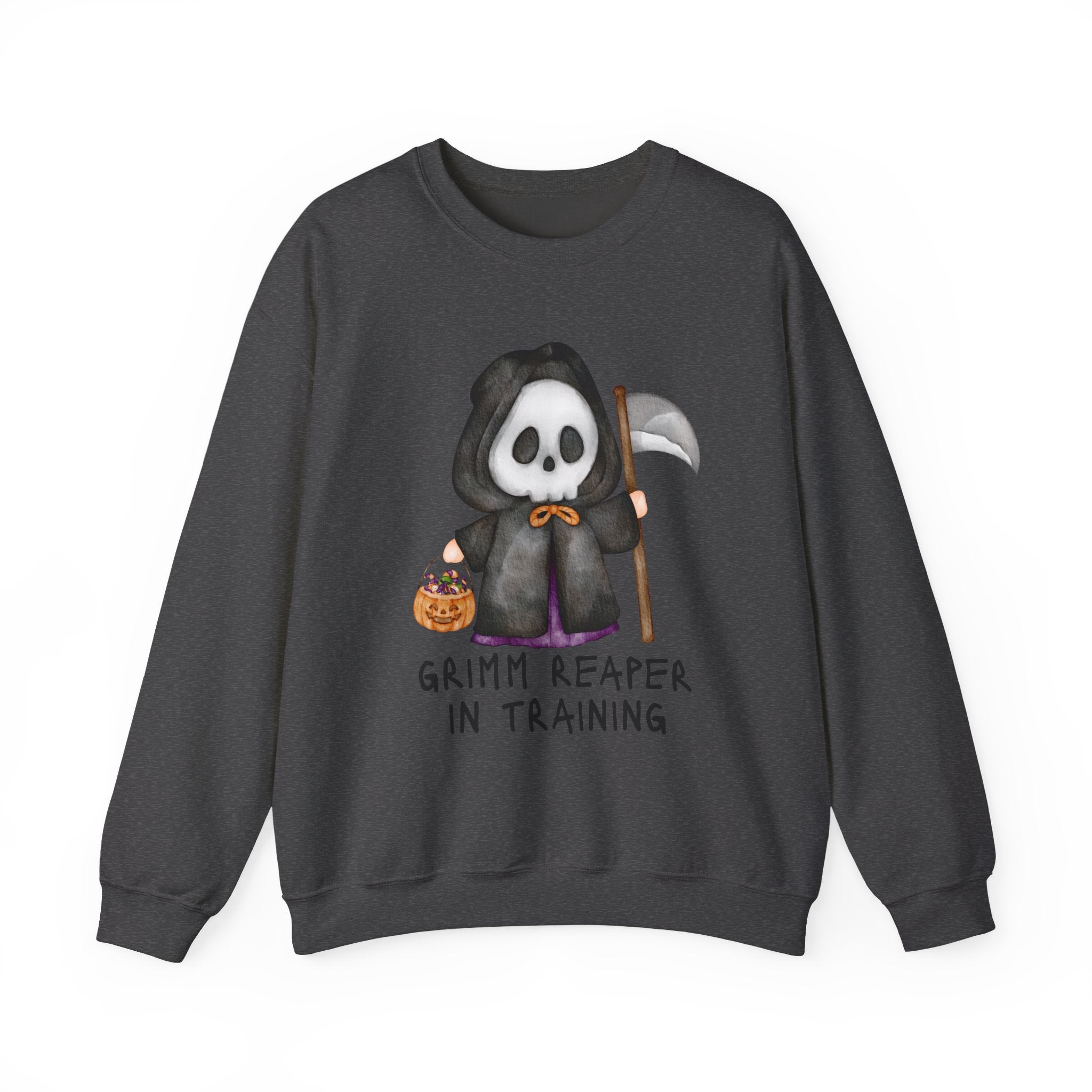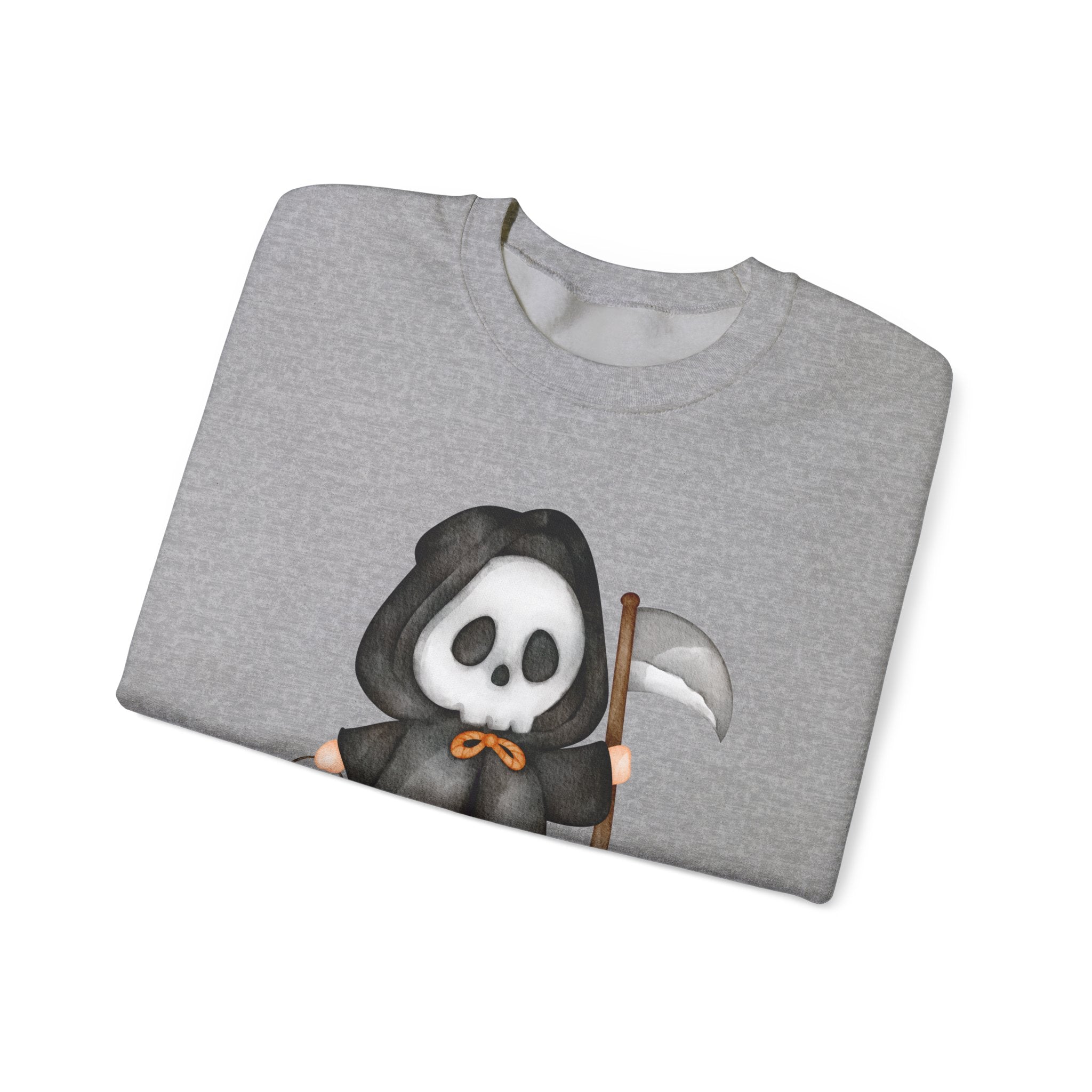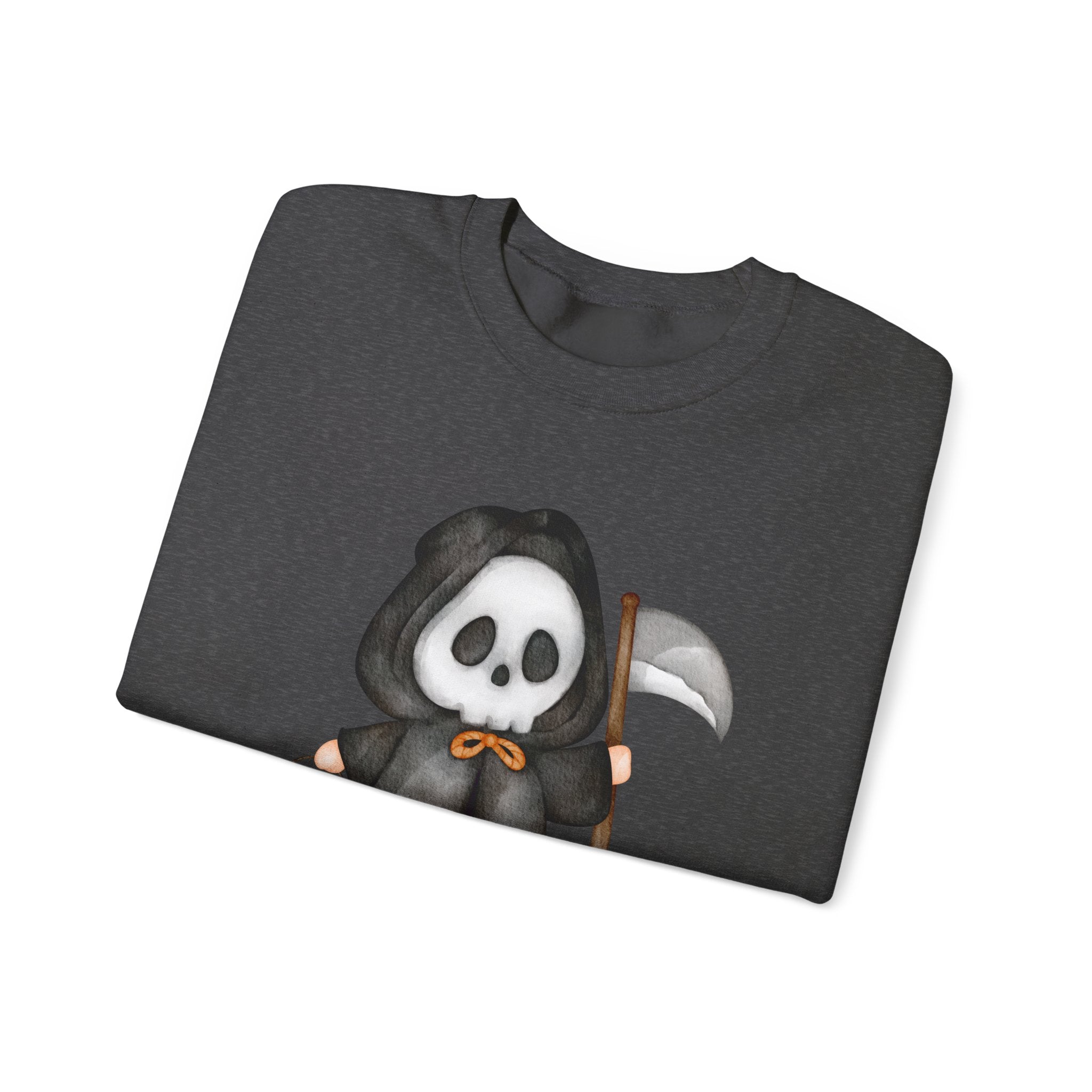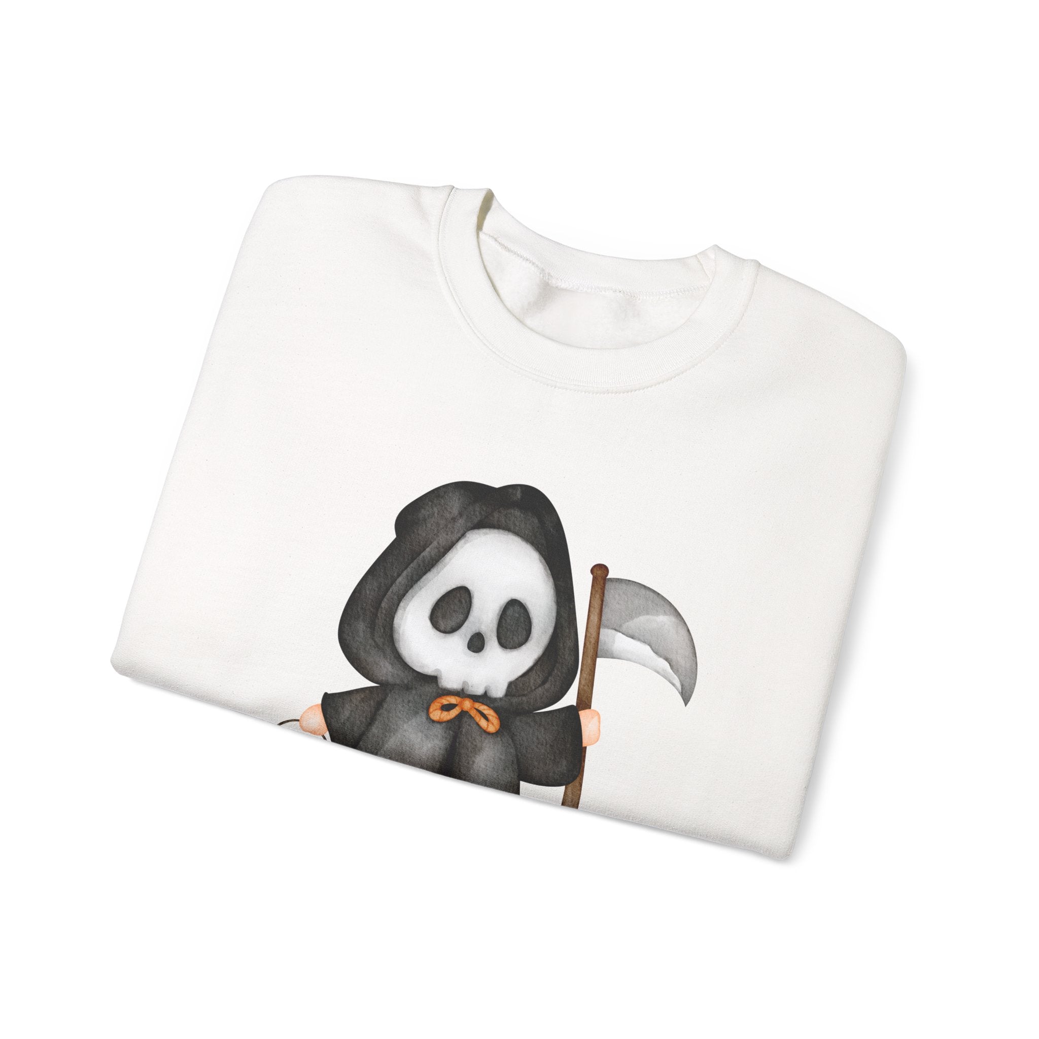 A cute grimm reaper in training graphic sweatshirt by Gildan, featuring the character carrying a scythe and a pumpkin trick or treat bucket, perfect for Halloween. This sweatshirt gives off a spooky yet adorable vibe, making it a must-have for Halloween enthusiasts. It is relevant to those looking for a fun and festive addition to their wardrobe during the Halloween season.