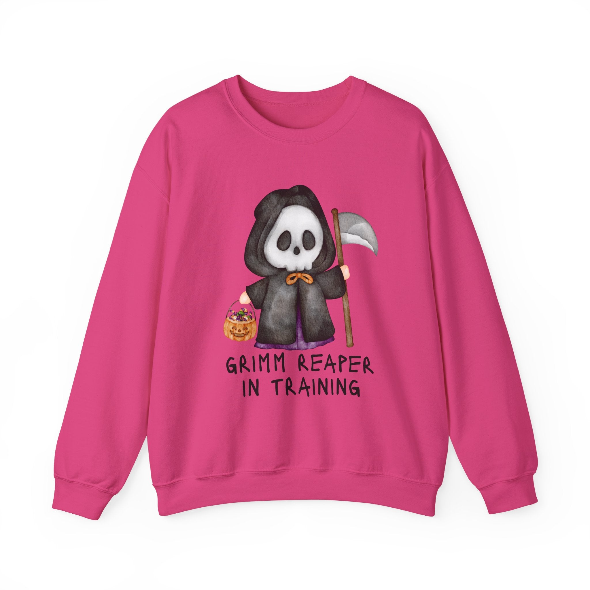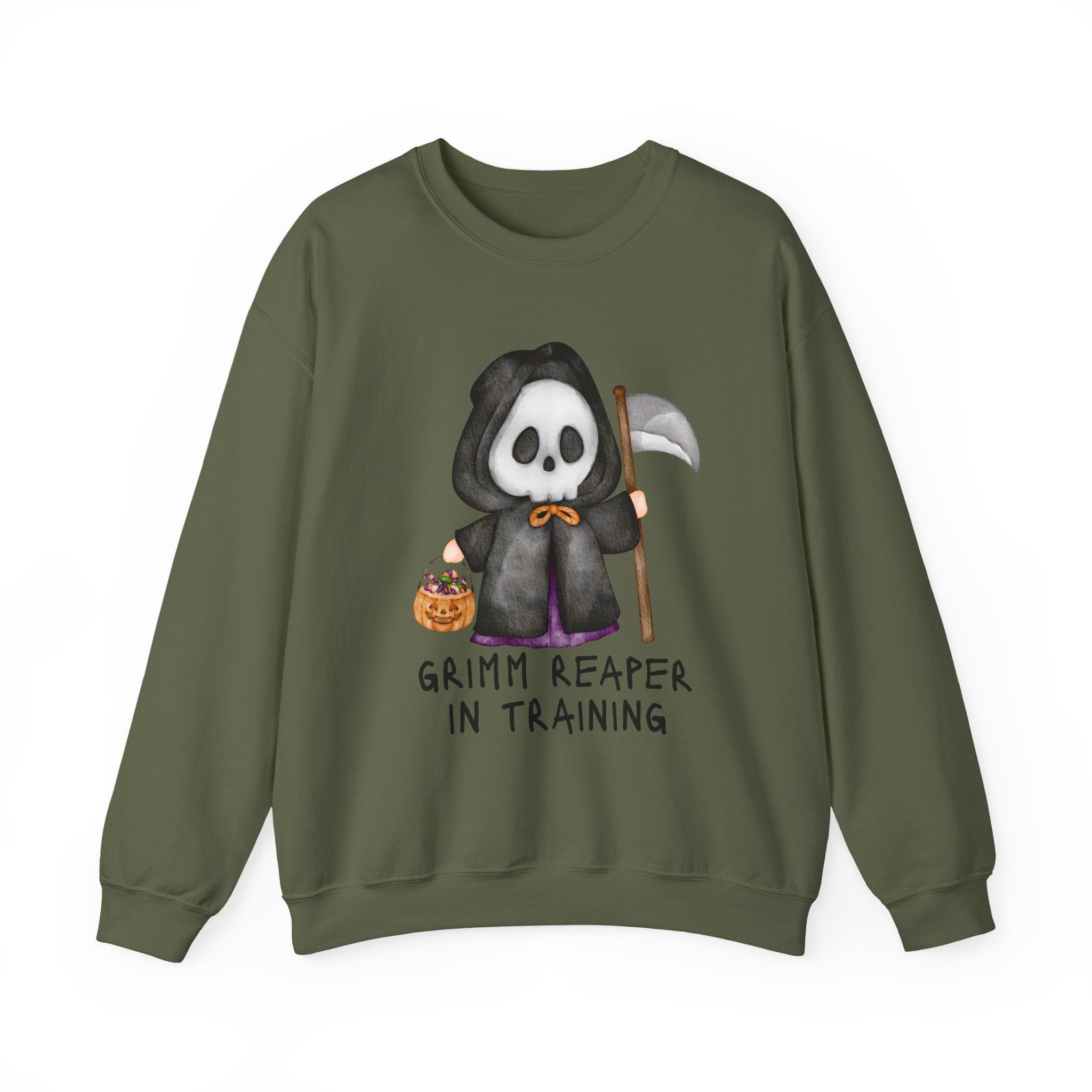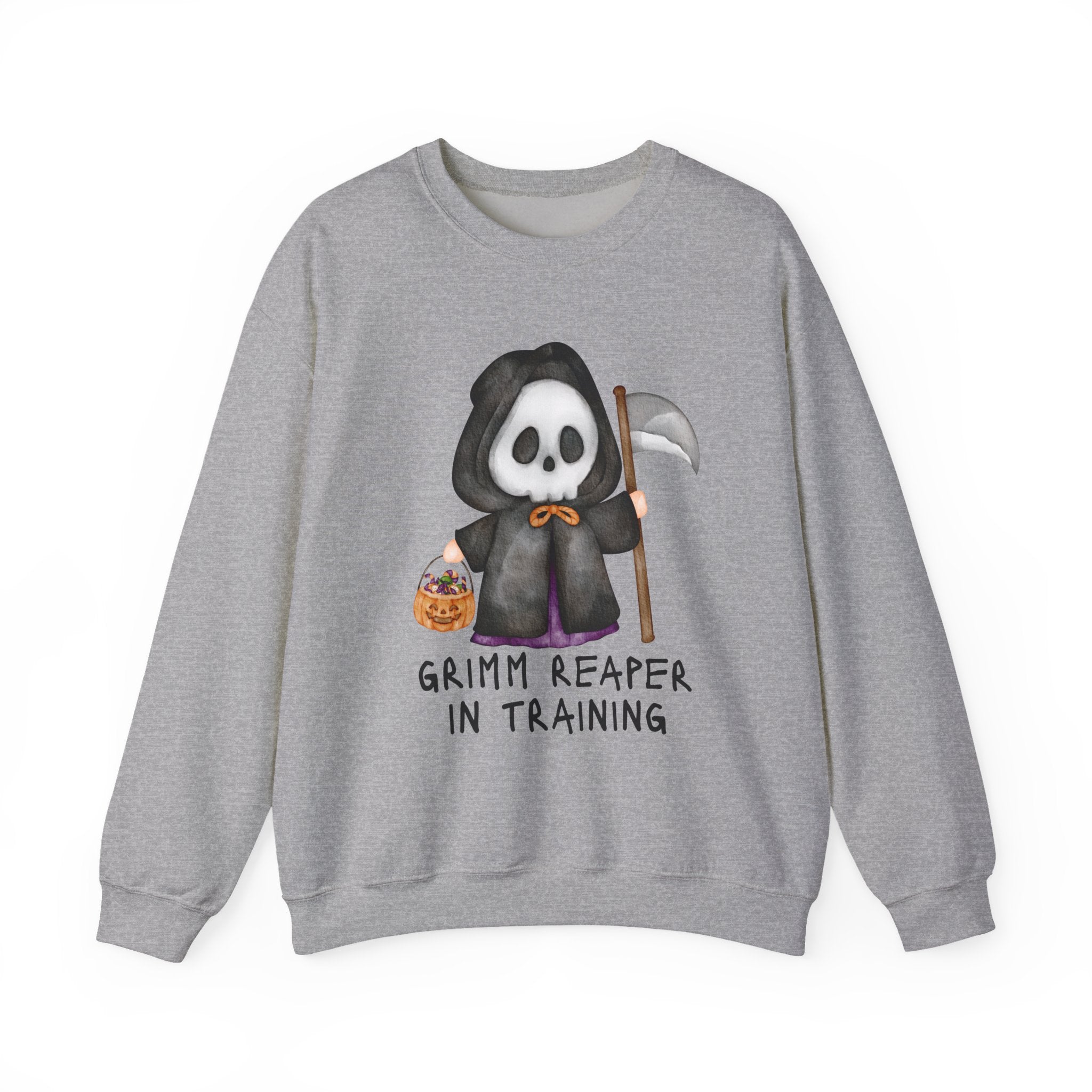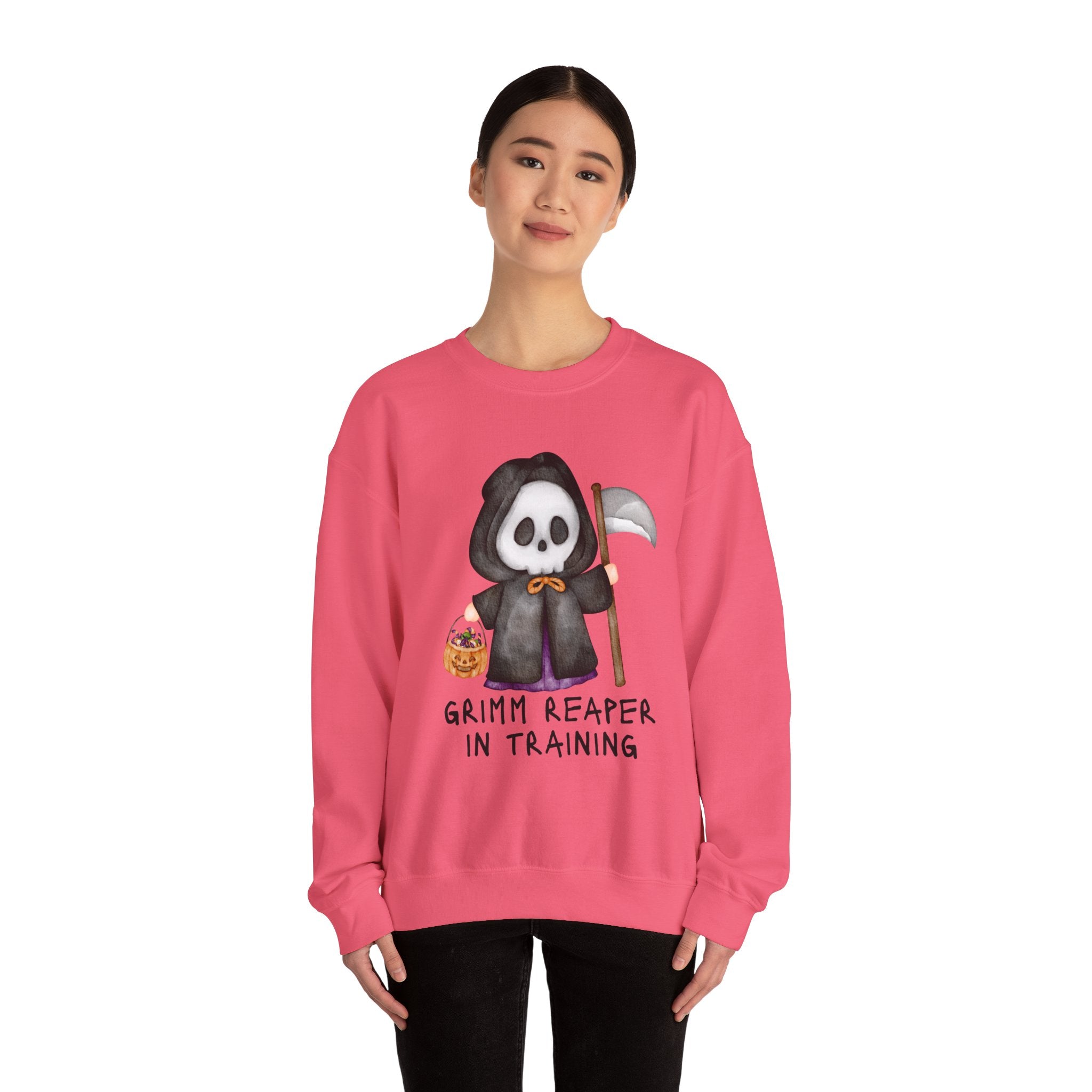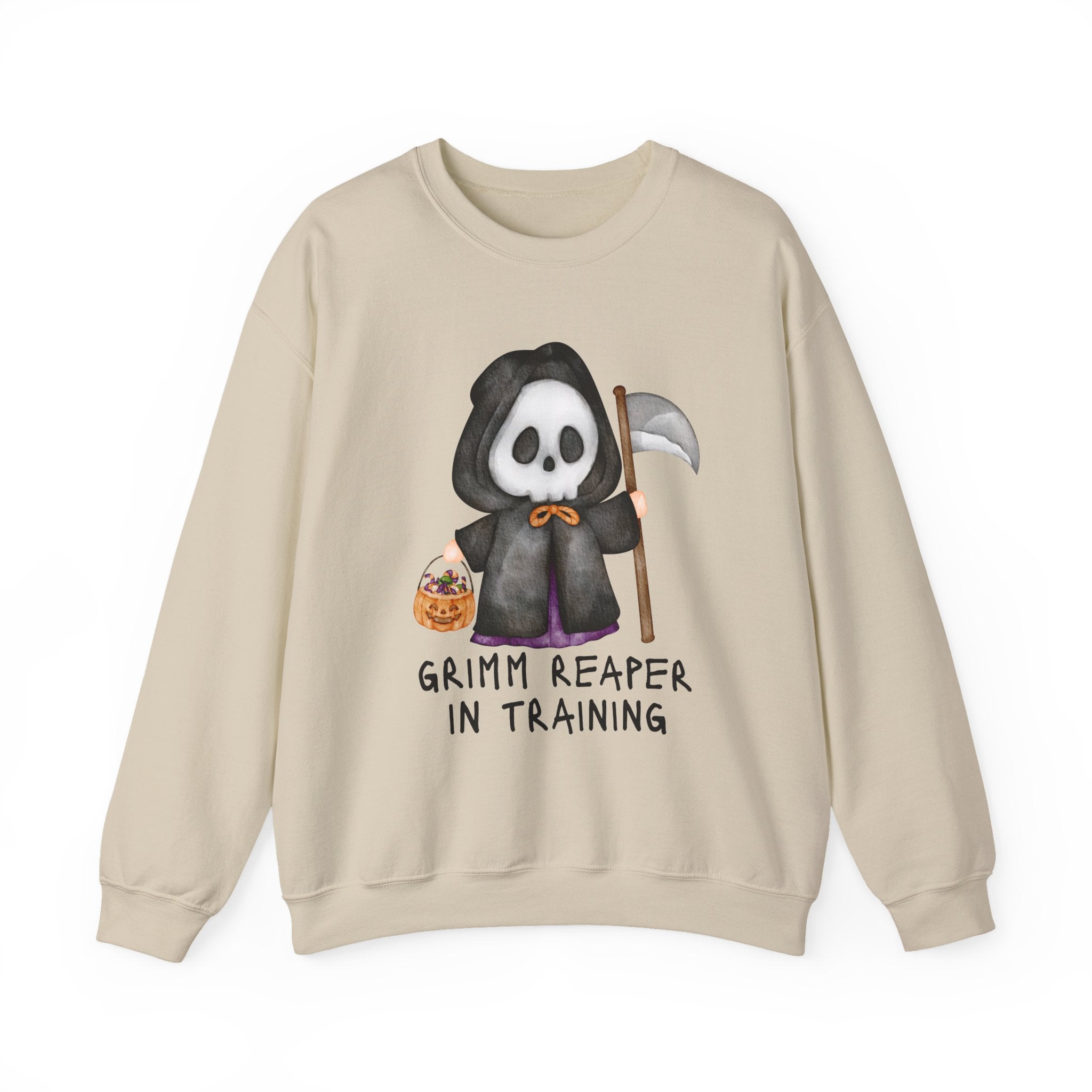 A cute grimm reaper in training graphic sweatshirt by Gildan, featuring the character carrying a scythe and a pumpkin trick or treat bucket, perfect for Halloween. This sweatshirt gives off a spooky yet adorable vibe, making it a must-have for Halloween enthusiasts. It is relevant to those looking for a fun and festive addition to their wardrobe during the Halloween season.