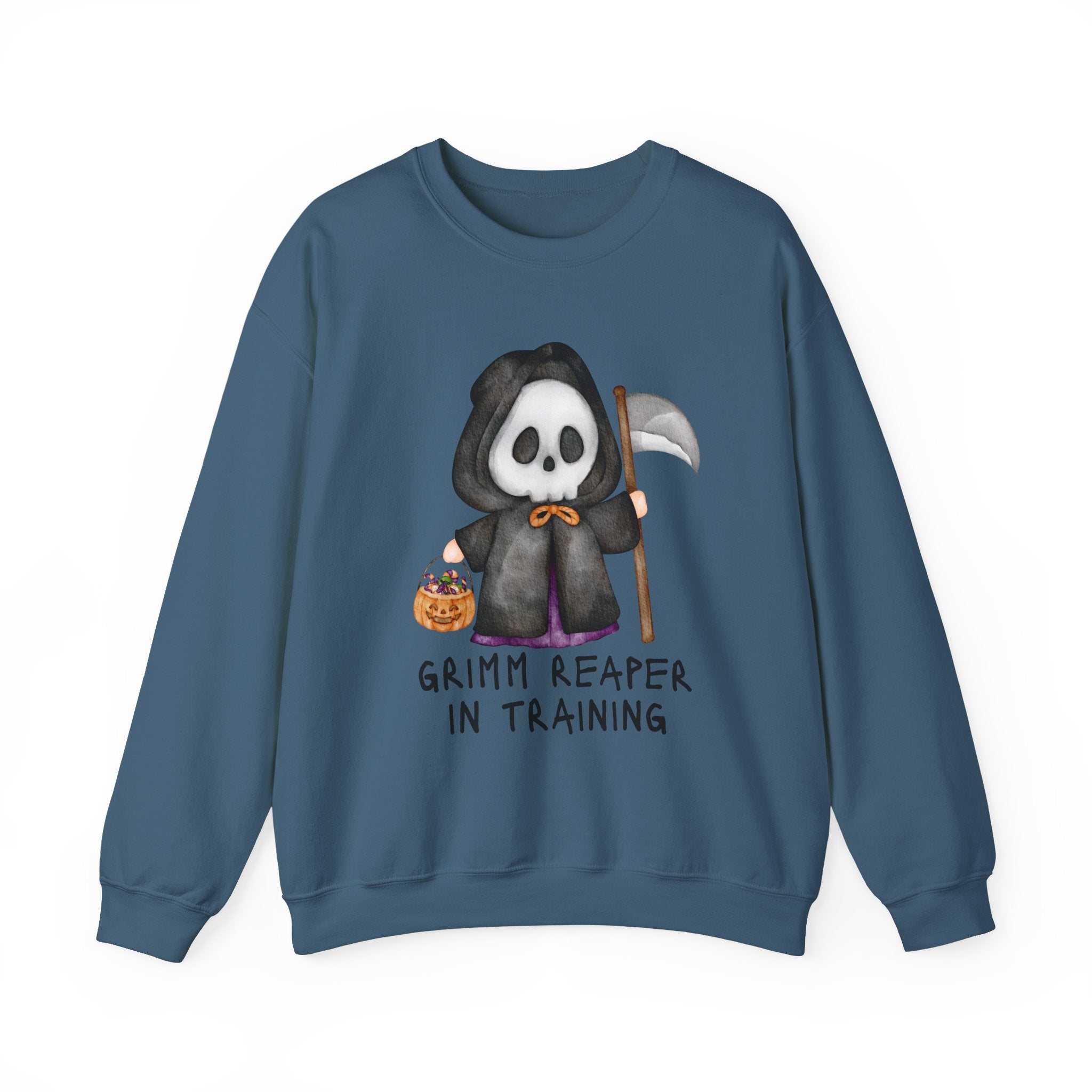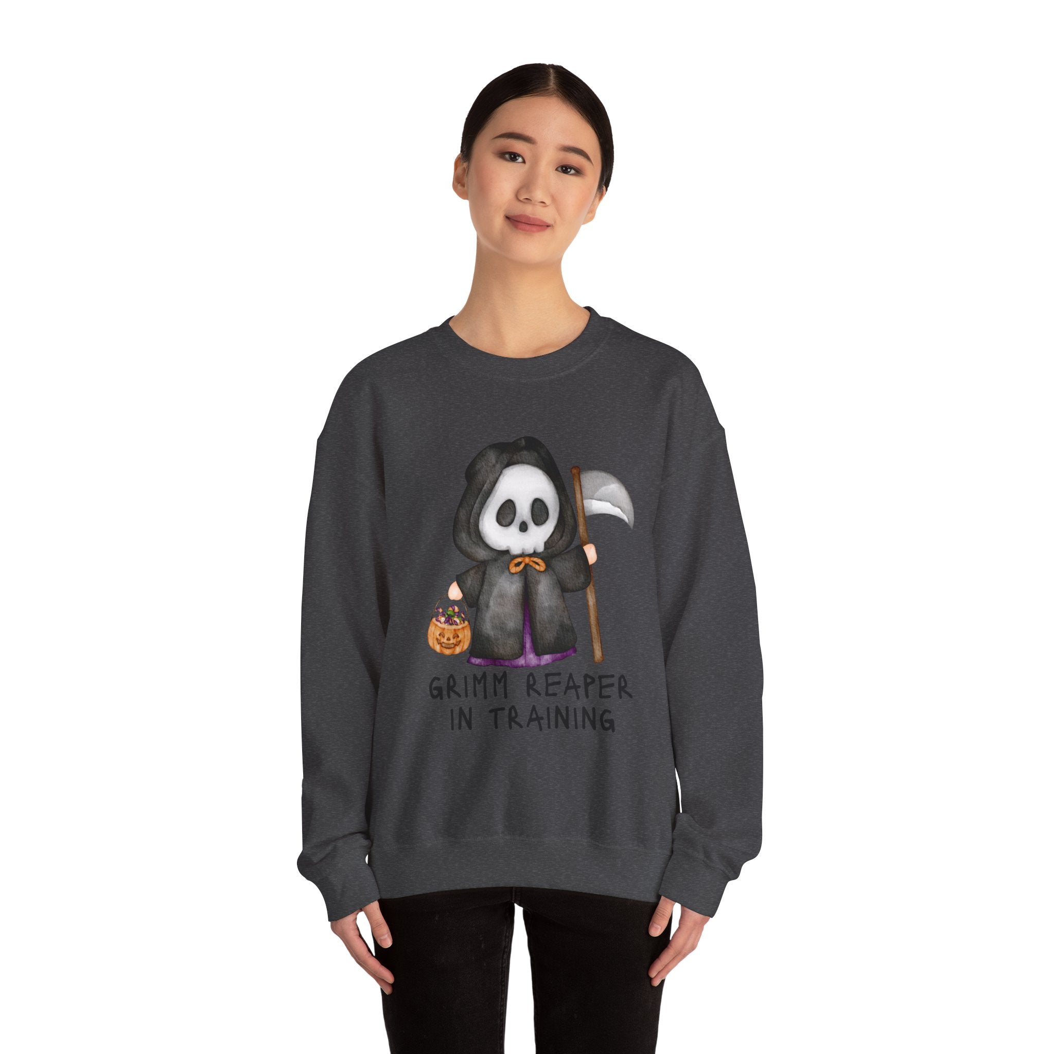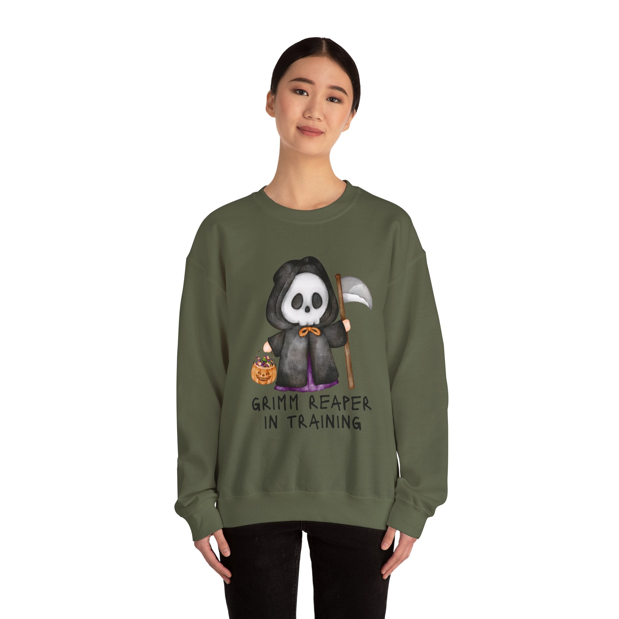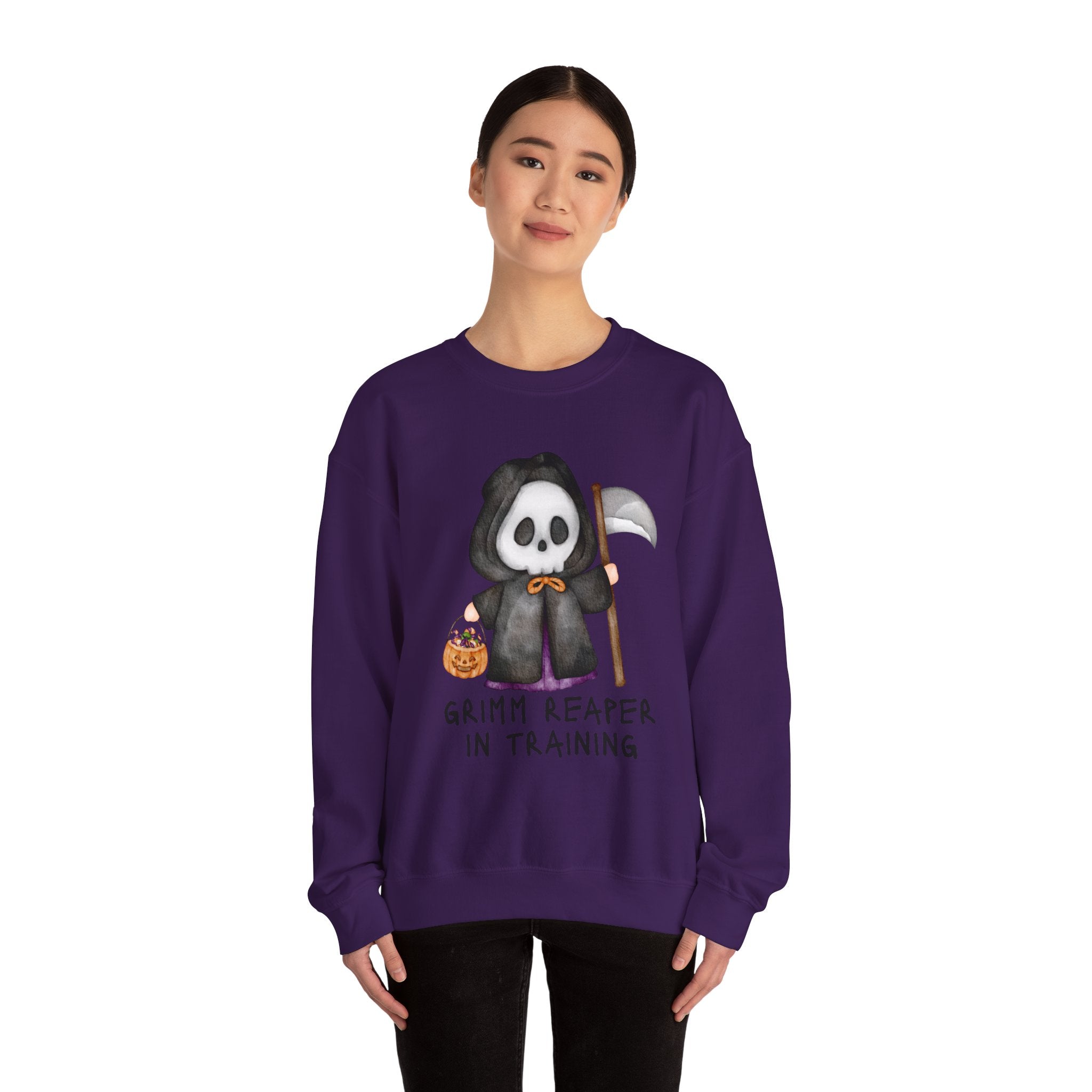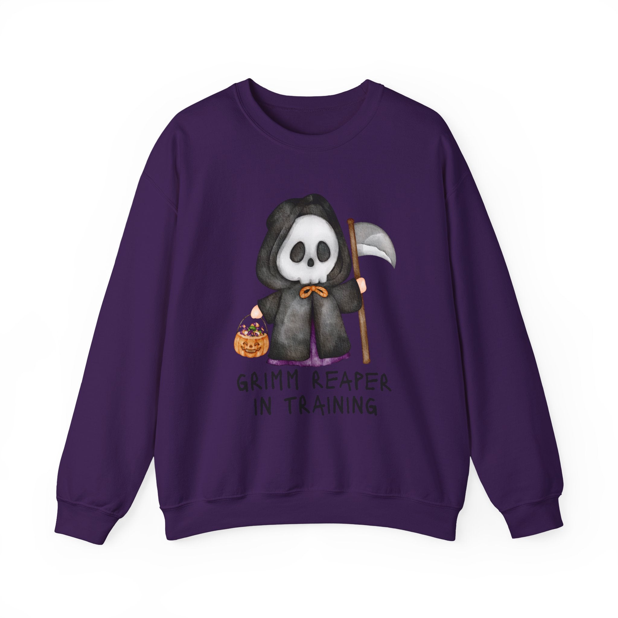A cute grimm reaper in training graphic sweatshirt by Gildan, featuring the character carrying a scythe and a pumpkin trick or treat bucket, perfect for Halloween. This sweatshirt gives off a spooky yet adorable vibe, making it a must-have for Halloween enthusiasts. It is relevant to those looking for a fun and festive addition to their wardrobe during the Halloween season.