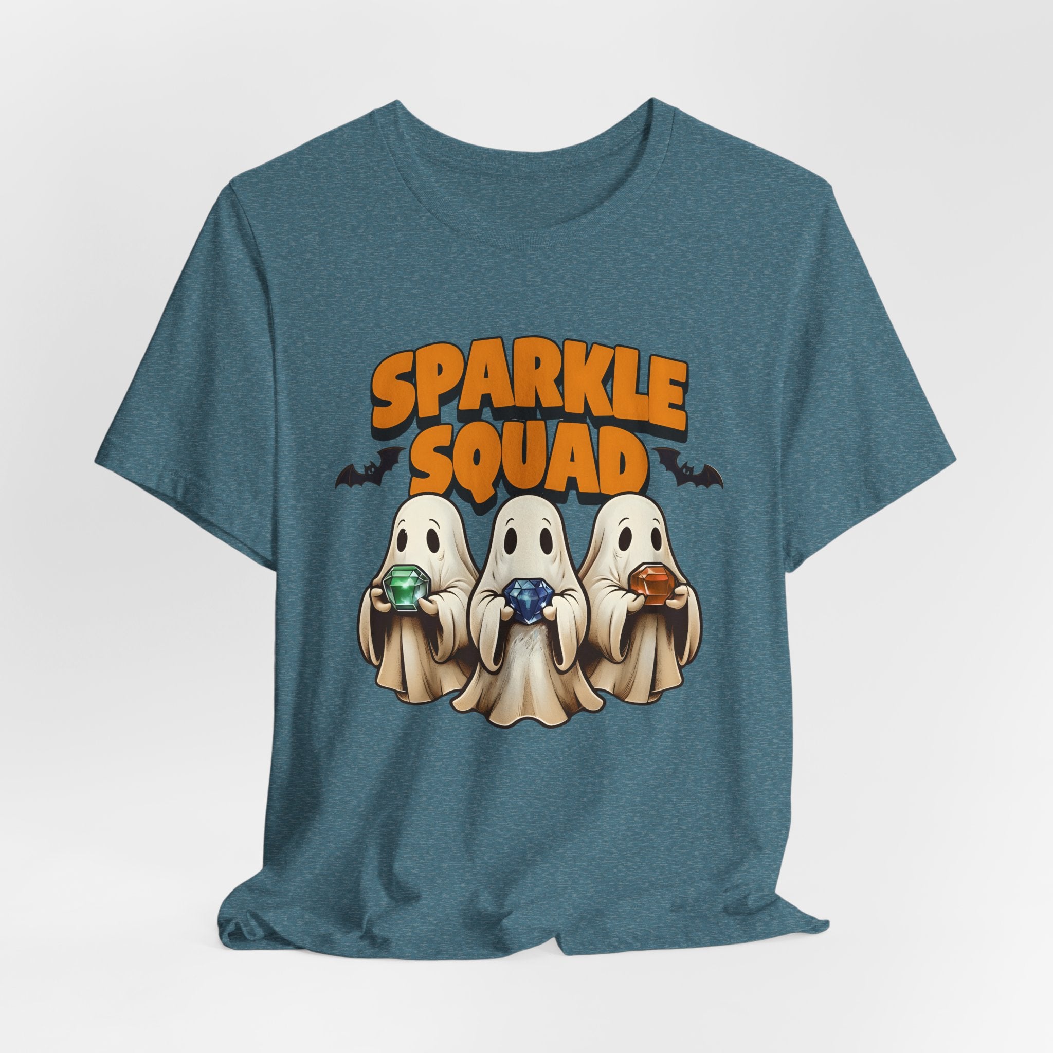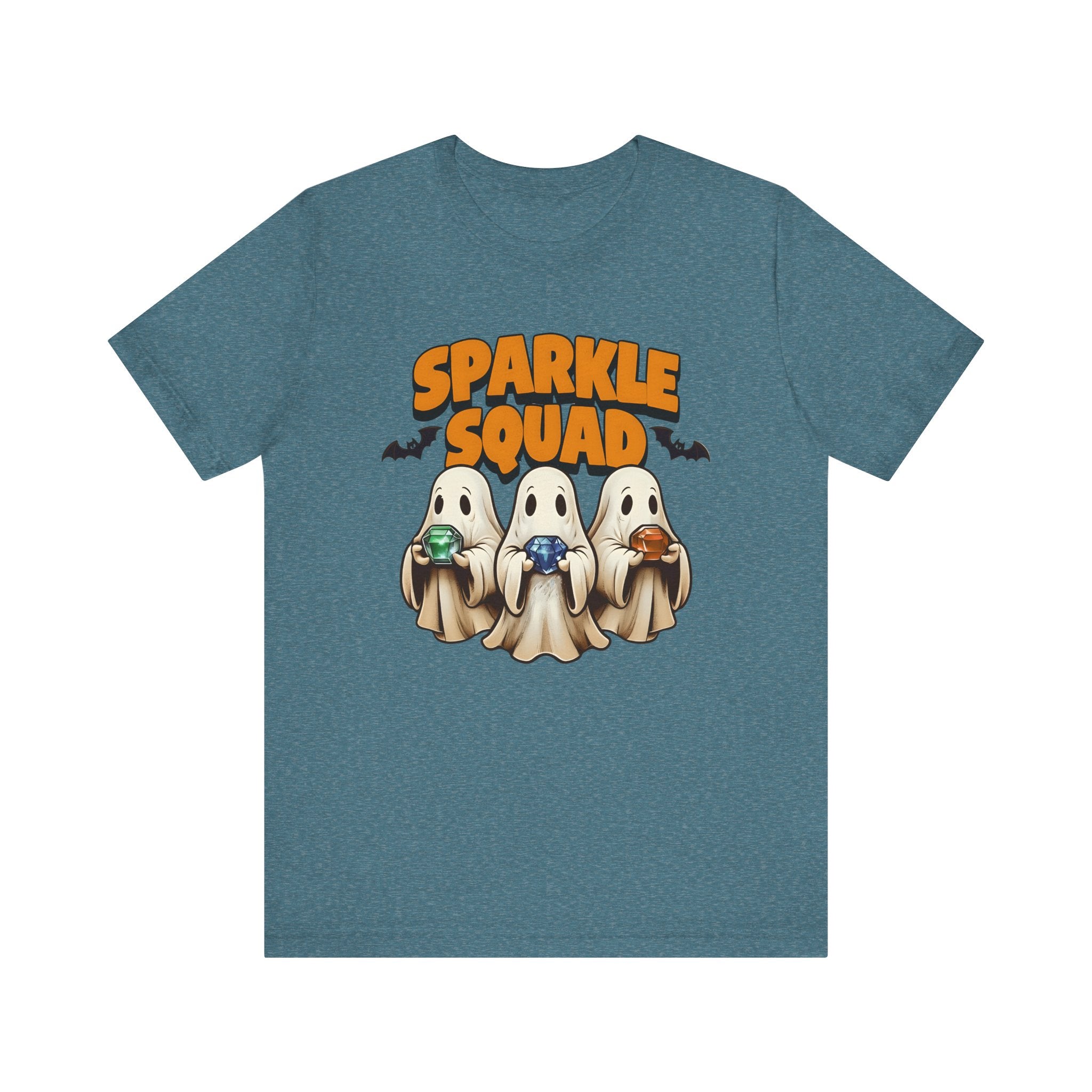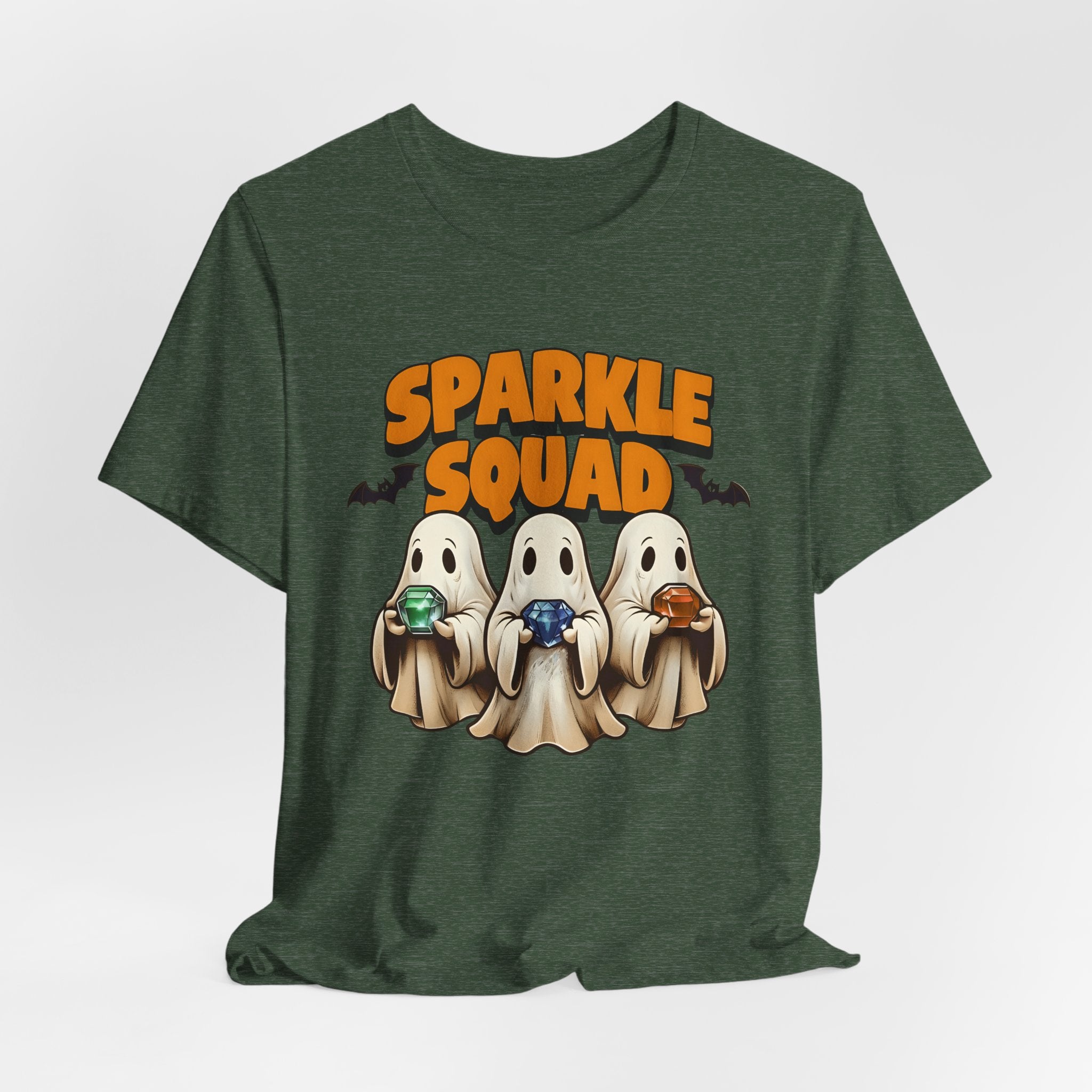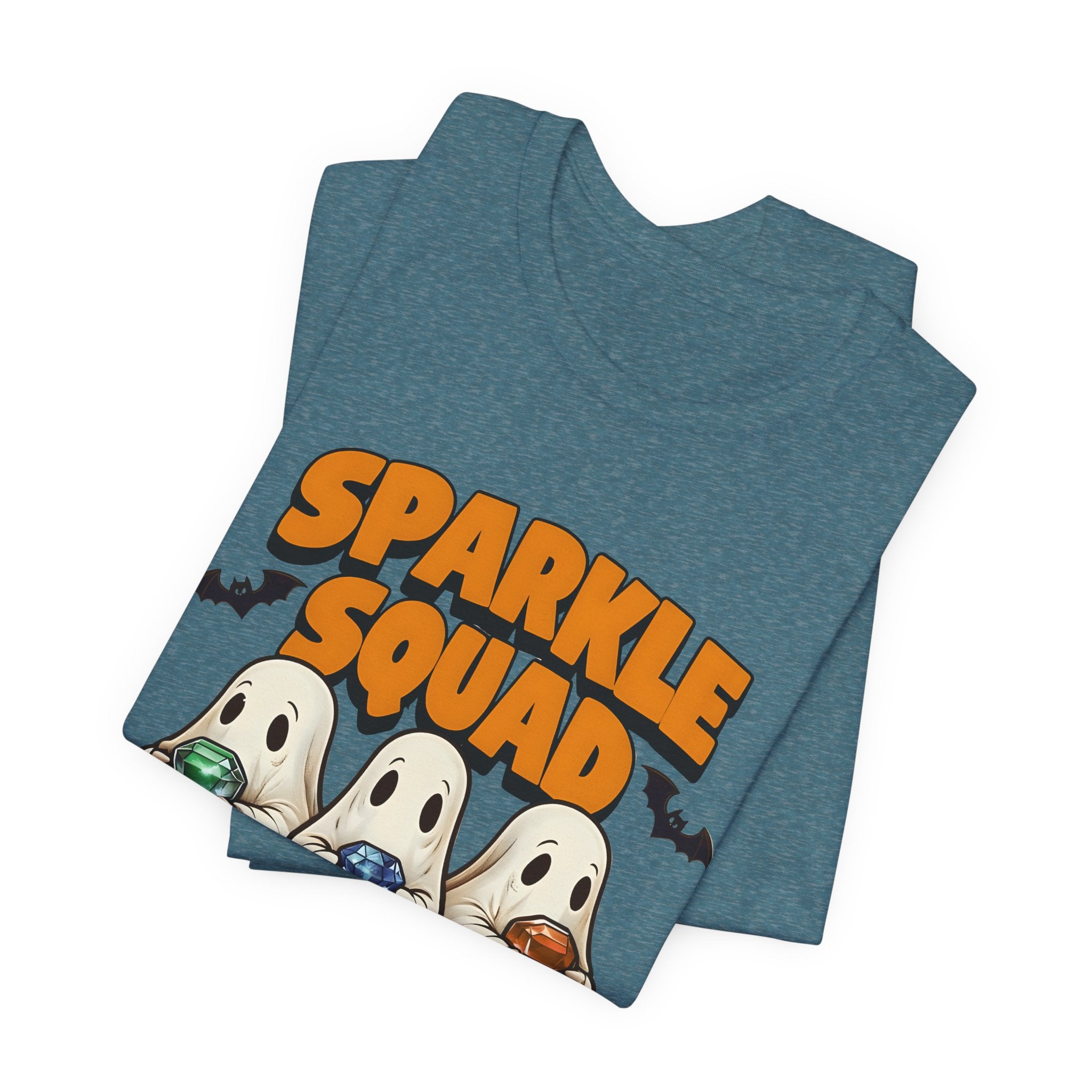 Embrace the spooky vibes with this adorable Unisex Jersey Short Sleeve Tee, perfect for the Halloween season. Featuring a charming 'Sparkle Squad' graphic, this tee captures a playful essence that brings joy to both kids and adults alike. It's an ideal choice for Halloween parties, trick-or-treating, or casual outings with friends. This festive addition to your wardrobe combines style and comfort, making it suitable for everyday wear or special celebrations. Whether you're a ghost lover or just want to showcase your fun side, this tee is designed for everyone who enjoys a touch of whimsy in their fashion. It's also a great gift for friends, family, or anyone looking to get into the Halloween spirit!