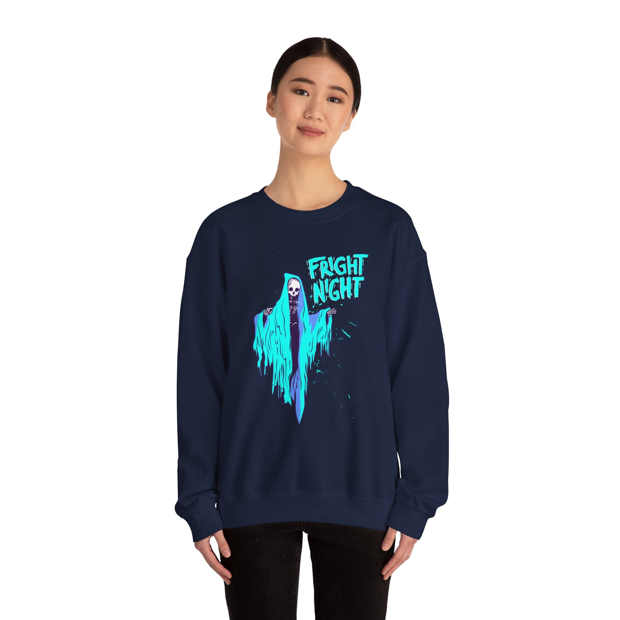 **š»š Spooky in Blue šš»** Ā Who said Halloween had to be all orange? This *Fright Night* sweatshirt featuring a vibrant blue neon ghost is here to light up your spooky season! šš® Perfect for cozy nights watching scary movies, exploring haunted houses, or keeping those skeletons in the closet! Ā šš¤ Not your typical Halloween vibe, but just as spooky! Ā This unisex heavy blend crewneck sweatshirt is pure comfort. These garments are made from polyester and cotton. This combination helps designs come out looking fresh and beautiful. The collar is ribbed knit, so it retains its shape even after washing. There are no itchy side seams on these sweaters.