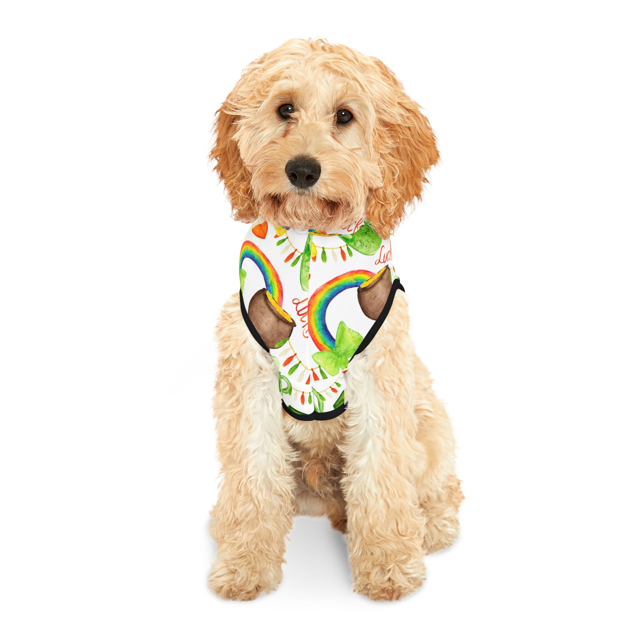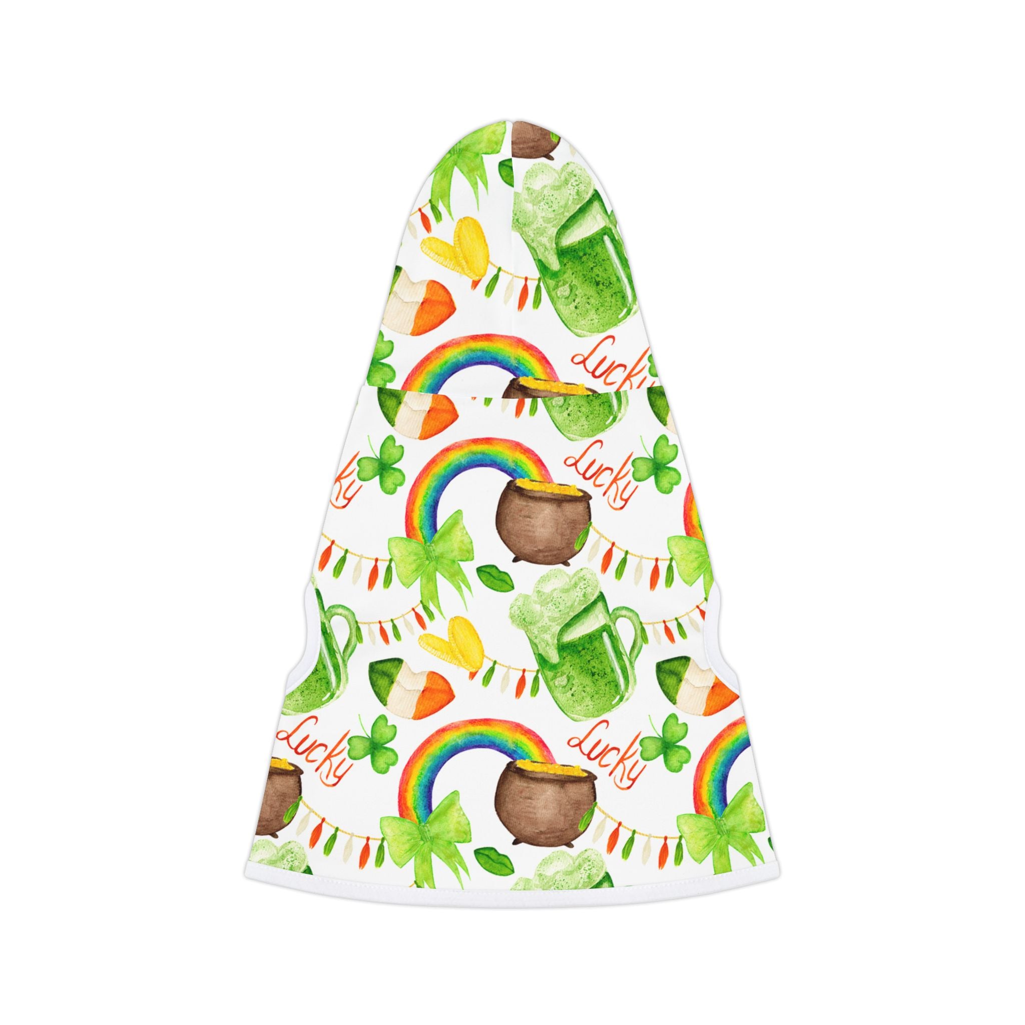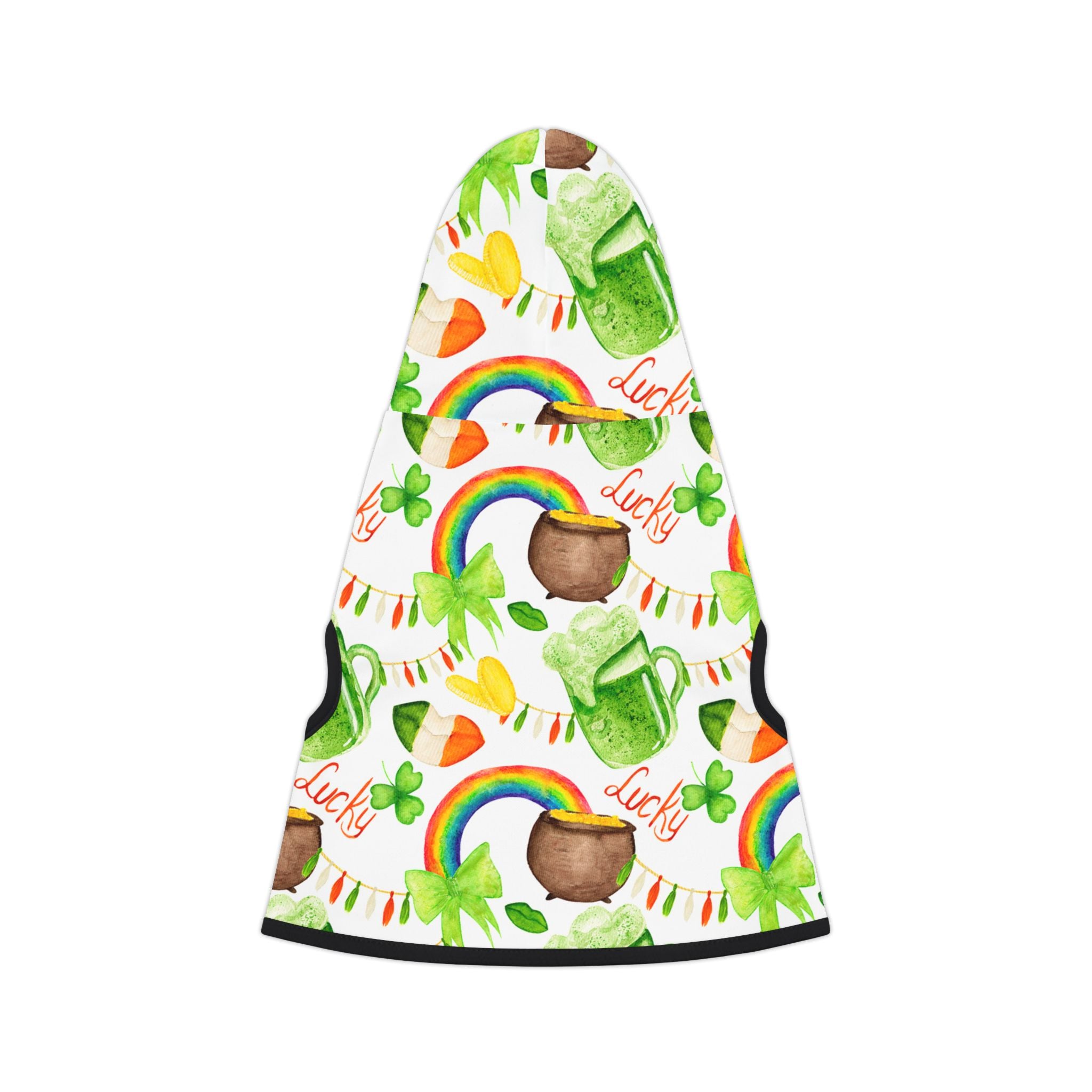 A green print pet hoodie perfect for St. Patrick's Day celebrations. This custom pet hoodie is made with 100% soft polyester, available in 7 sizes, and comes with a choice of black or white rib color options. Assembled in the USA, this hoodie is both durable and stylish, adding a festive touch to your furry friend's wardrobe.