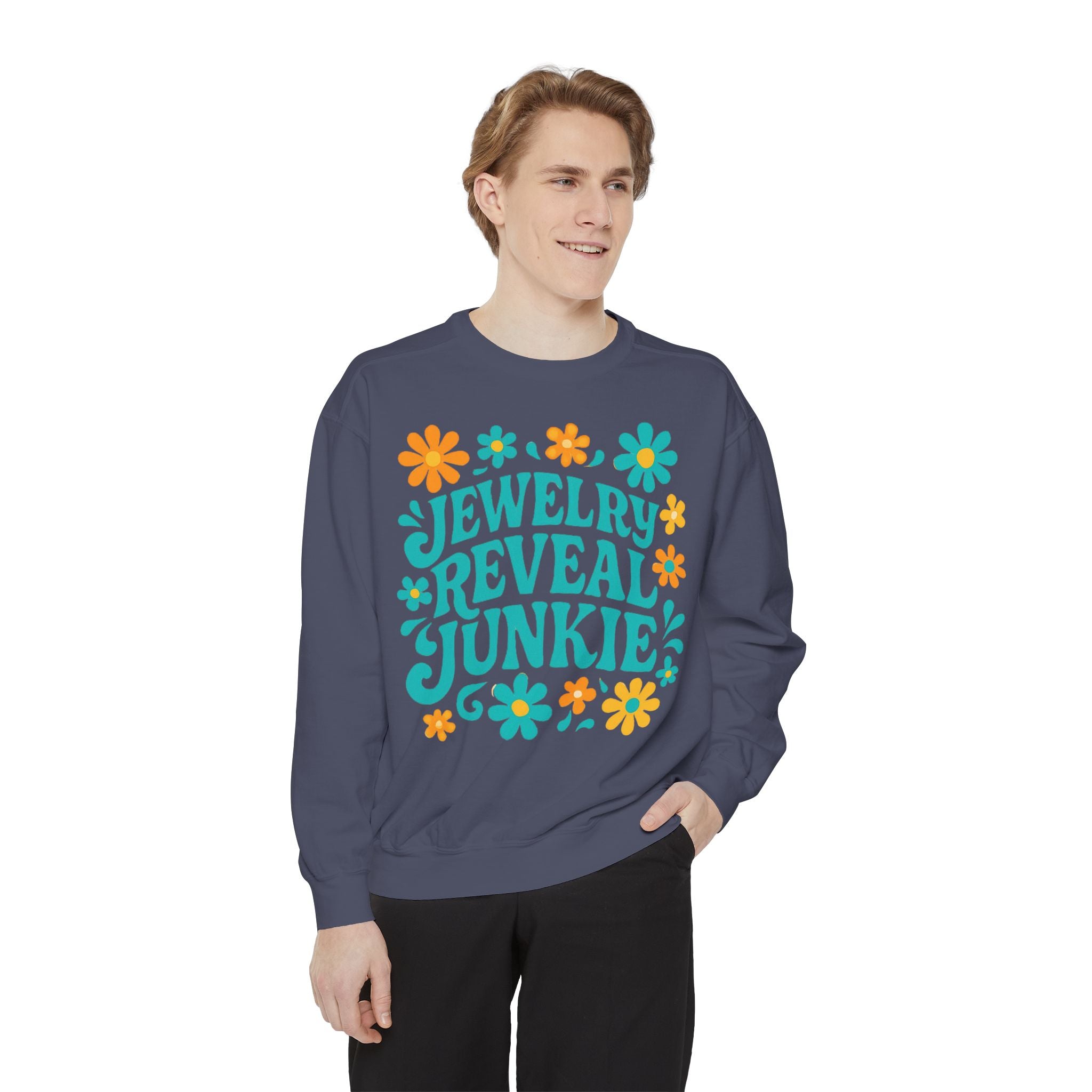 This unisex jewelry reveal junkie sweatshirt by Comfort Colors is perfect for those who love jewelry. The sweatshirt is comfortable and well-fitted, with a soft and luxurious feel. Ideal for adults, this medium-heavy fabric sweatshirt features embroidery decoration options on the left and center chest print areas.