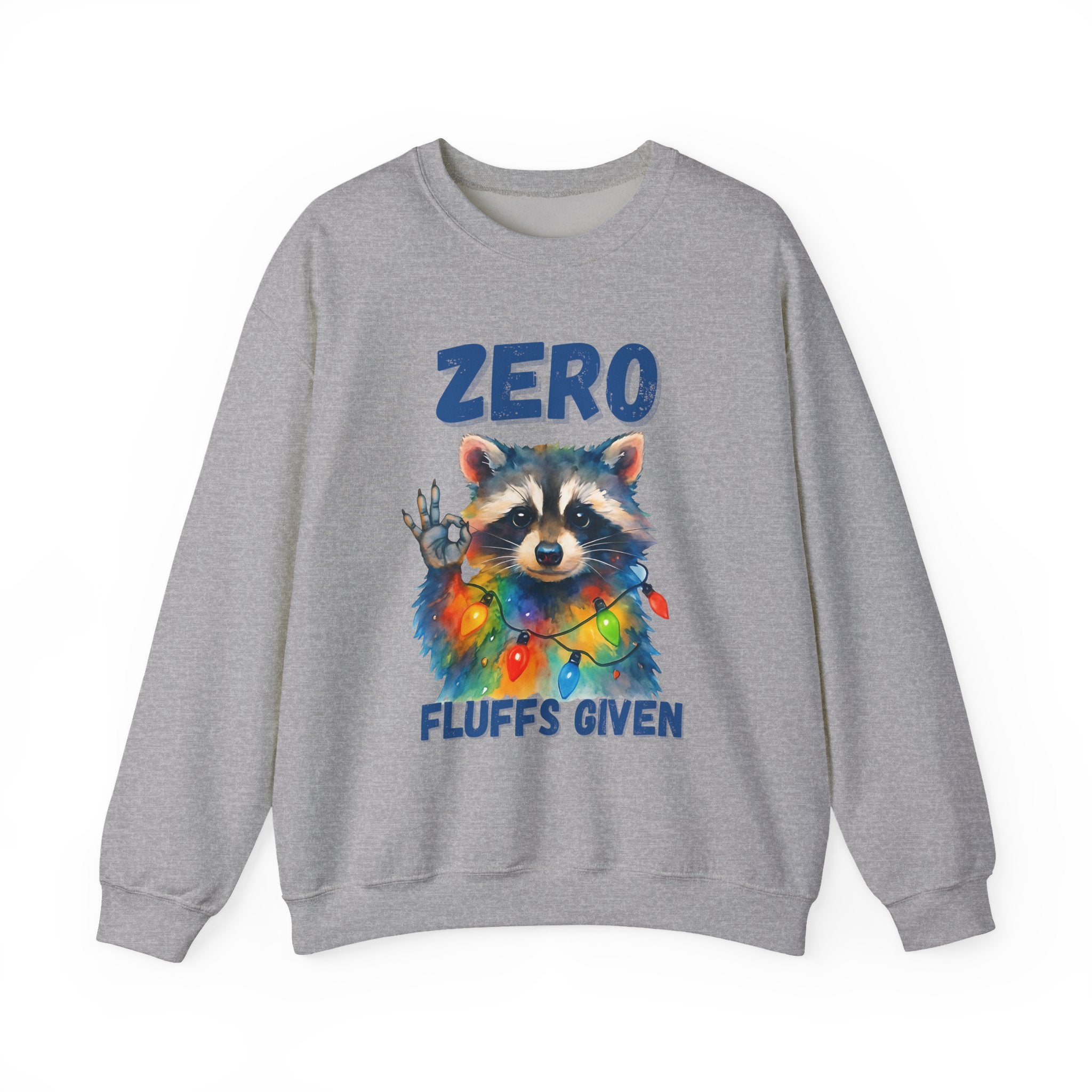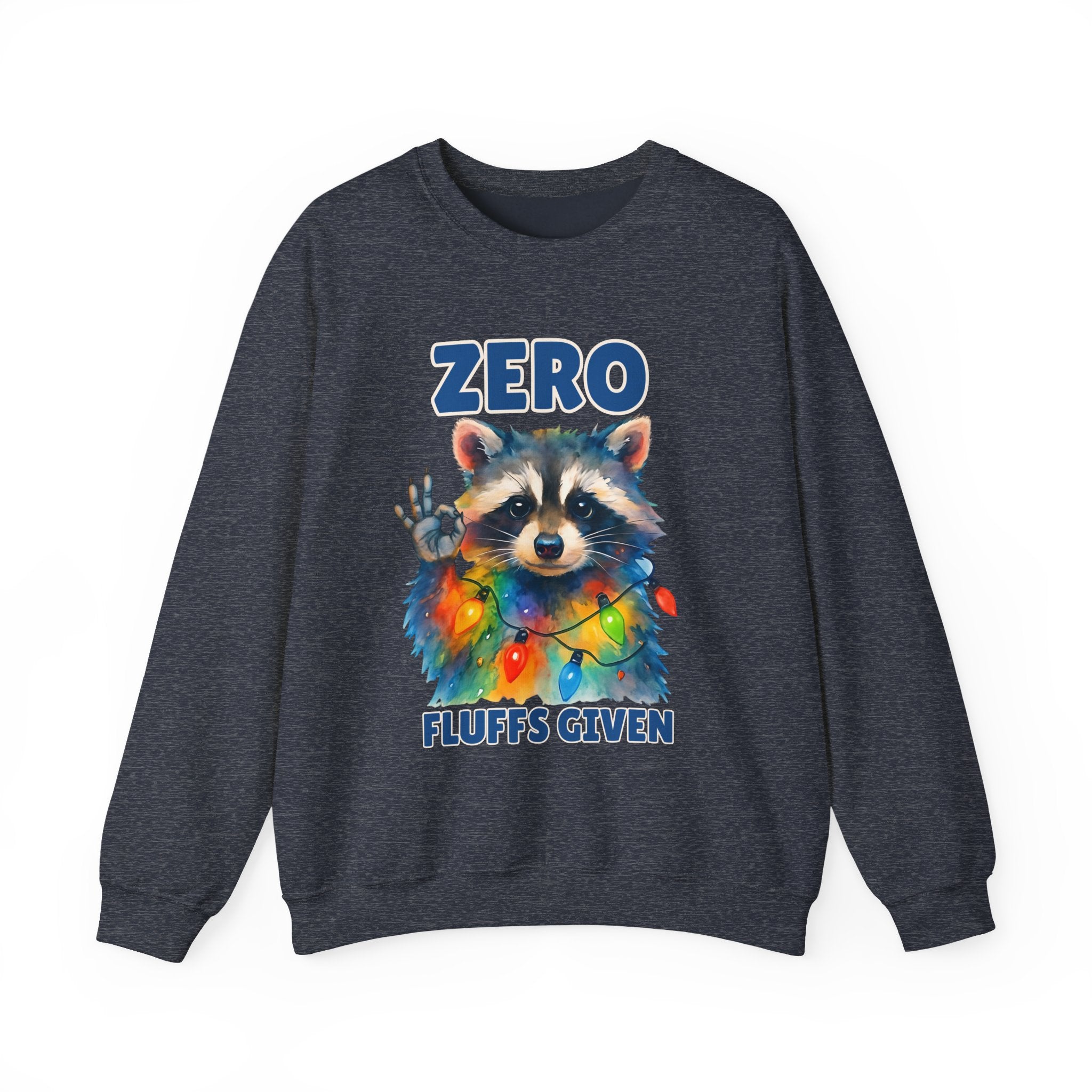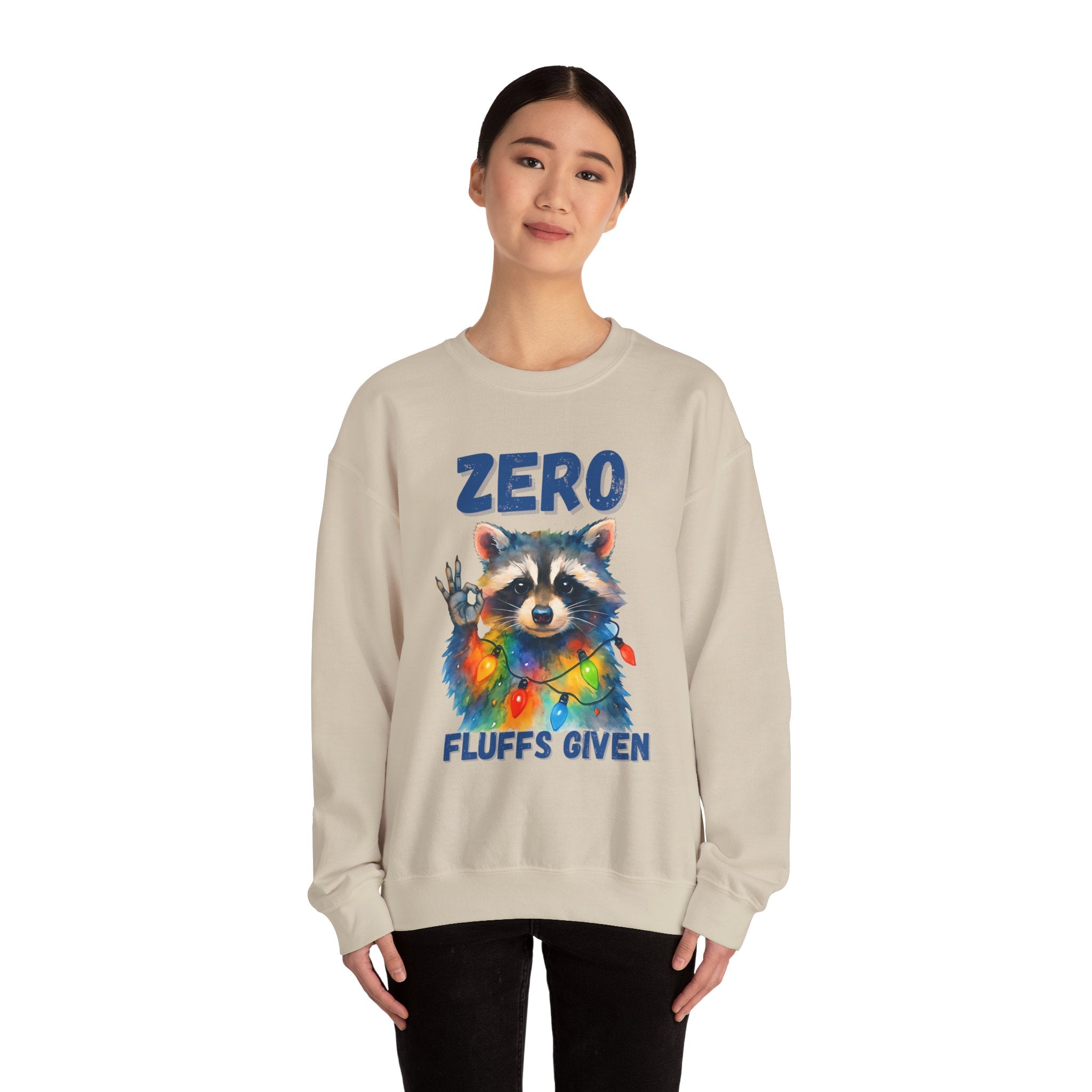 This cozy crewneck brings playful attitude and soft warmth to chilly days. A whimsical raccoon wrapped in colorful string lights stares back with a cheeky hand gesture and the words “ZERO FLUFFS GIVEN,” turning a classic sweatshirt into a statement piece you’ll reach for when you want comfort with a wink. The medium-heavy blend and clean-cut crew silhouette make it easy to layer over tees or lounge in on slow weekends. Subtle durability details — double-needle stitching and a tear-away label — mean this sweatshirt will stay comfortable and wearable for years. It’s the kind of casual piece that sparks smiles, starts conversations, and slides into holiday gatherings or relaxed nights by the fire.