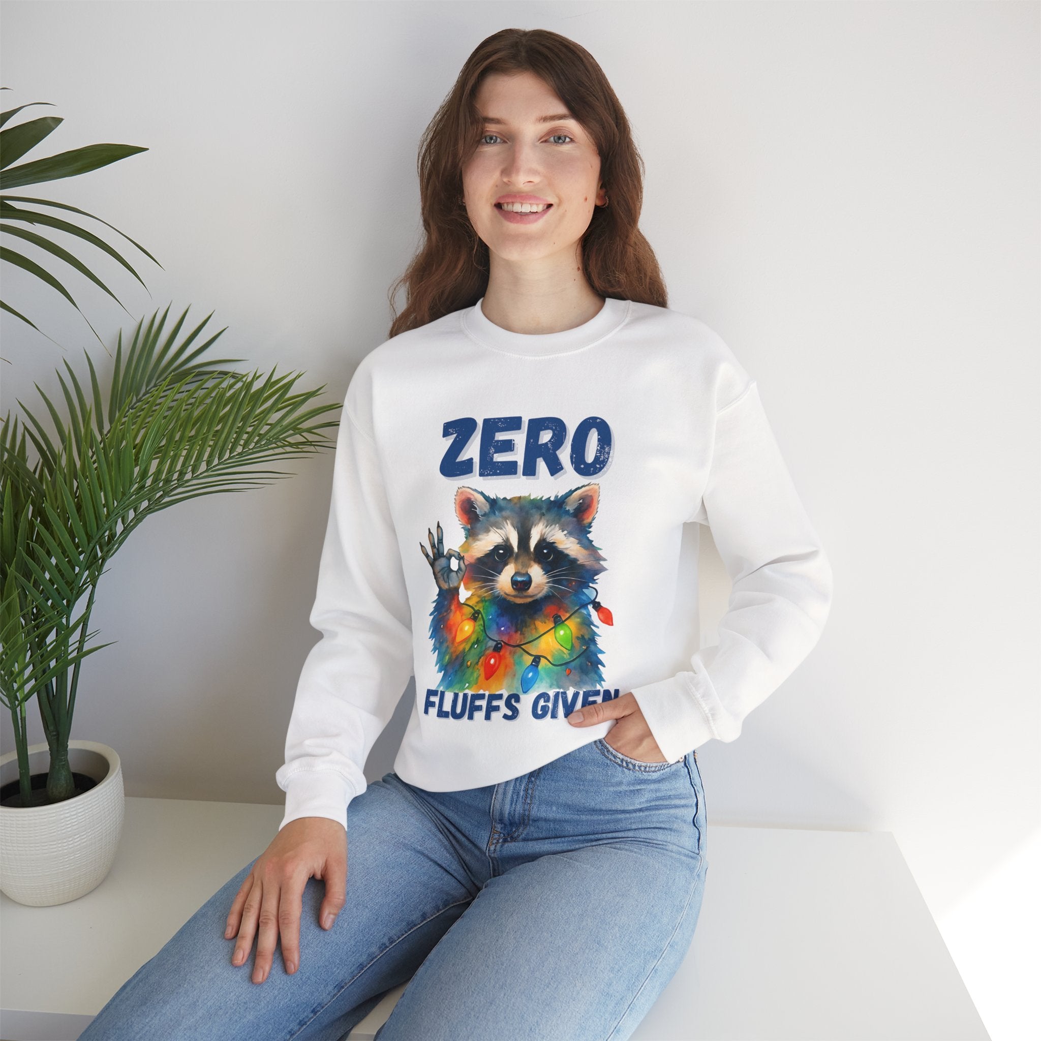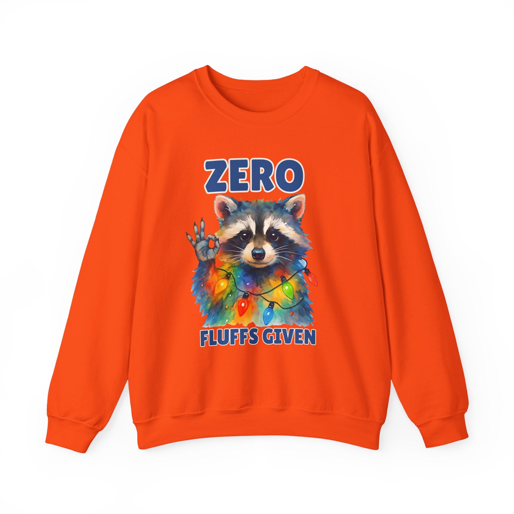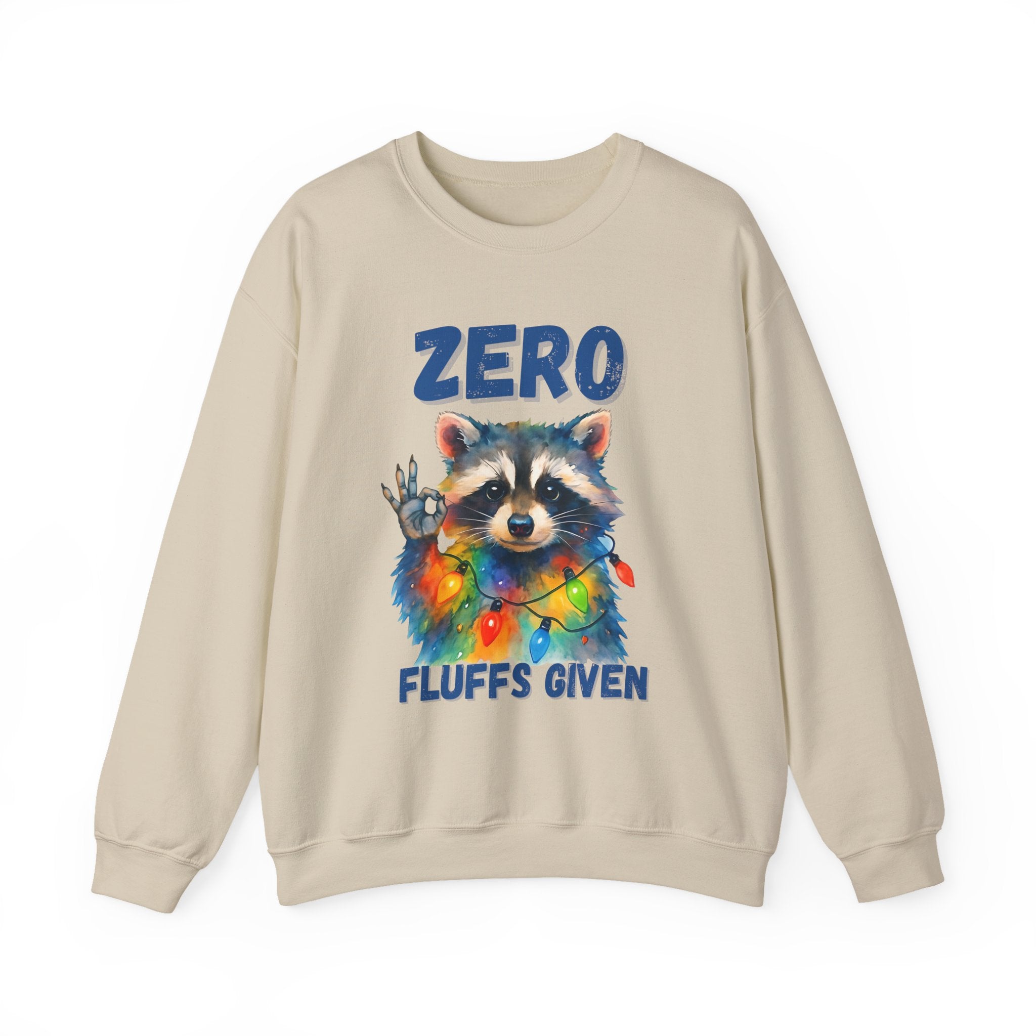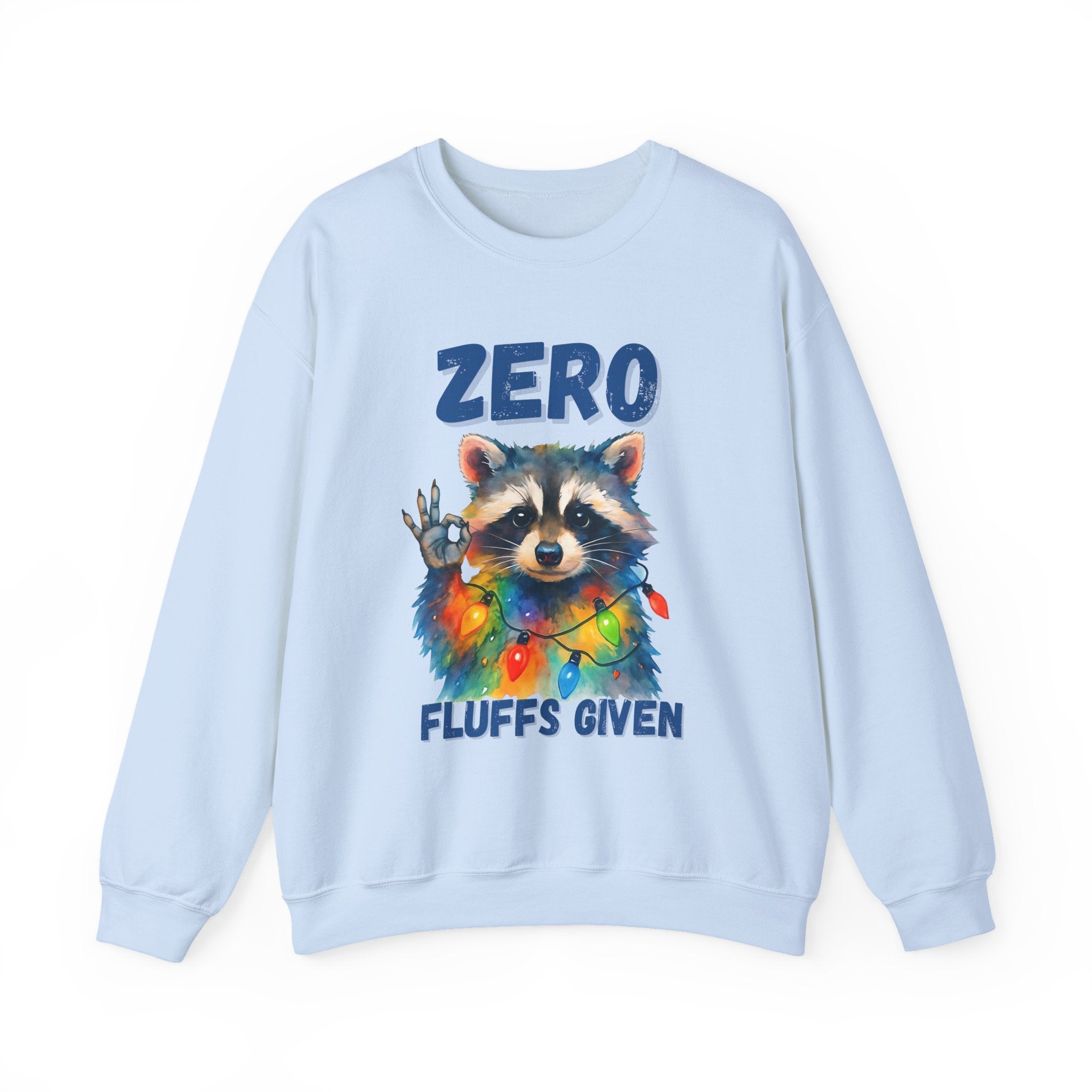 This cozy crewneck brings playful attitude and soft warmth to chilly days. A whimsical raccoon wrapped in colorful string lights stares back with a cheeky hand gesture and the words “ZERO FLUFFS GIVEN,” turning a classic sweatshirt into a statement piece you’ll reach for when you want comfort with a wink. The medium-heavy blend and clean-cut crew silhouette make it easy to layer over tees or lounge in on slow weekends. Subtle durability details — double-needle stitching and a tear-away label — mean this sweatshirt will stay comfortable and wearable for years. It’s the kind of casual piece that sparks smiles, starts conversations, and slides into holiday gatherings or relaxed nights by the fire.