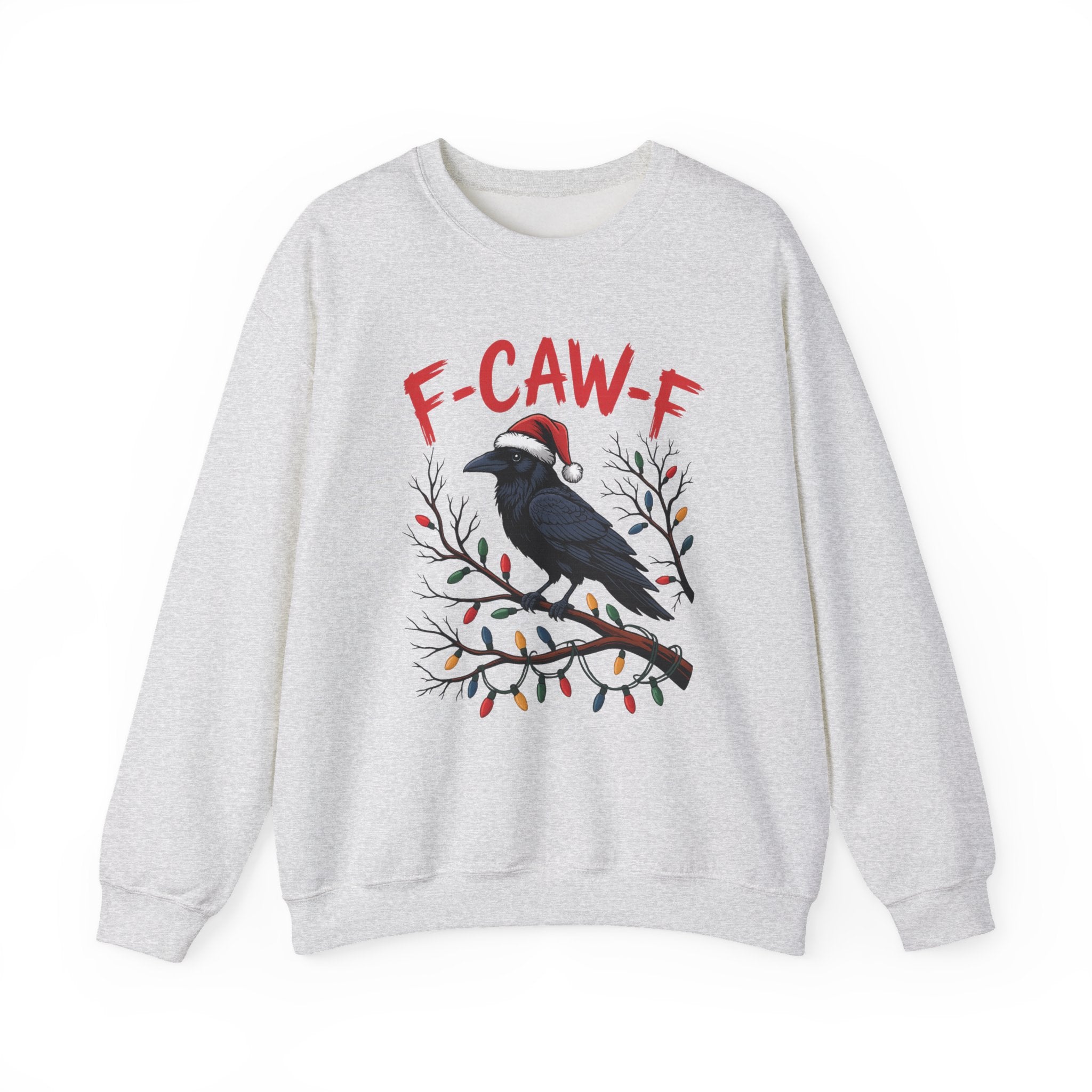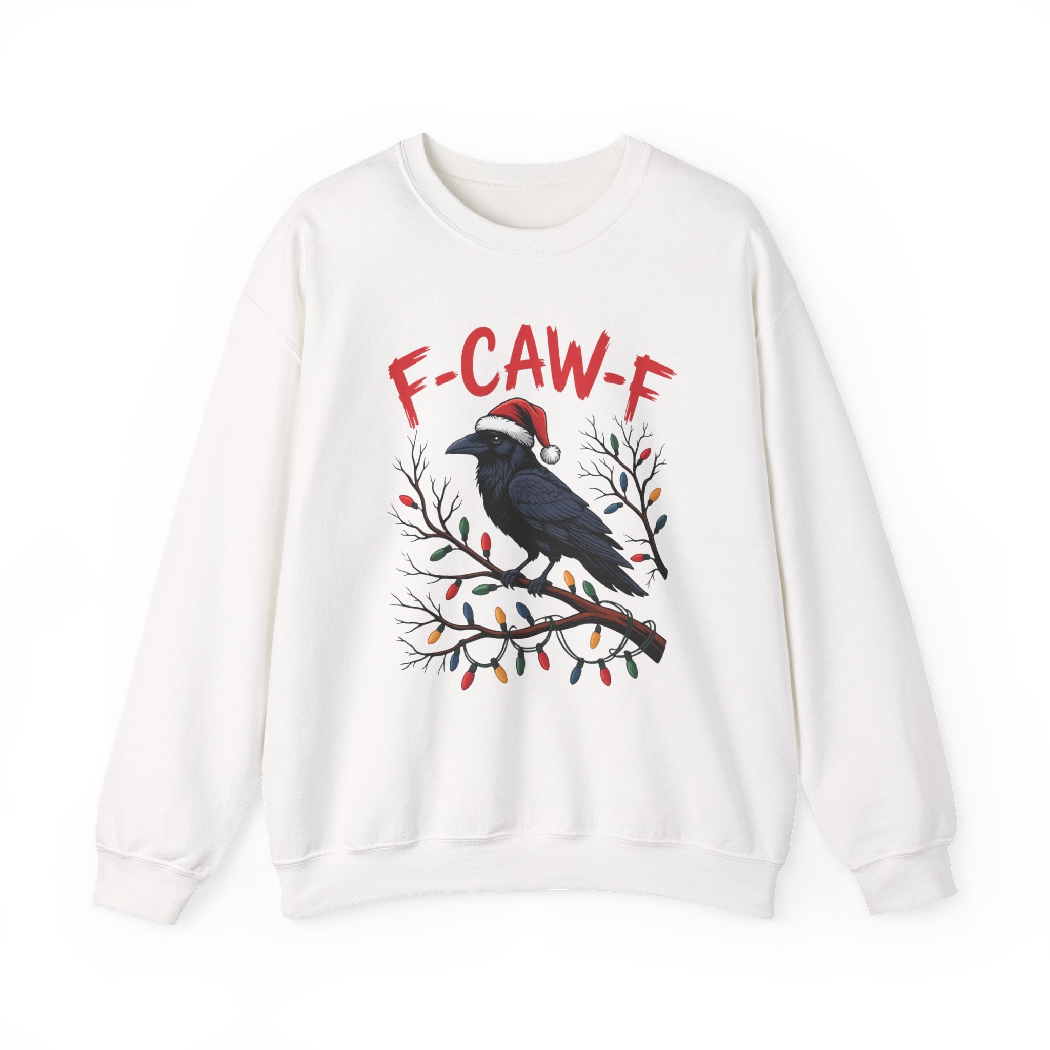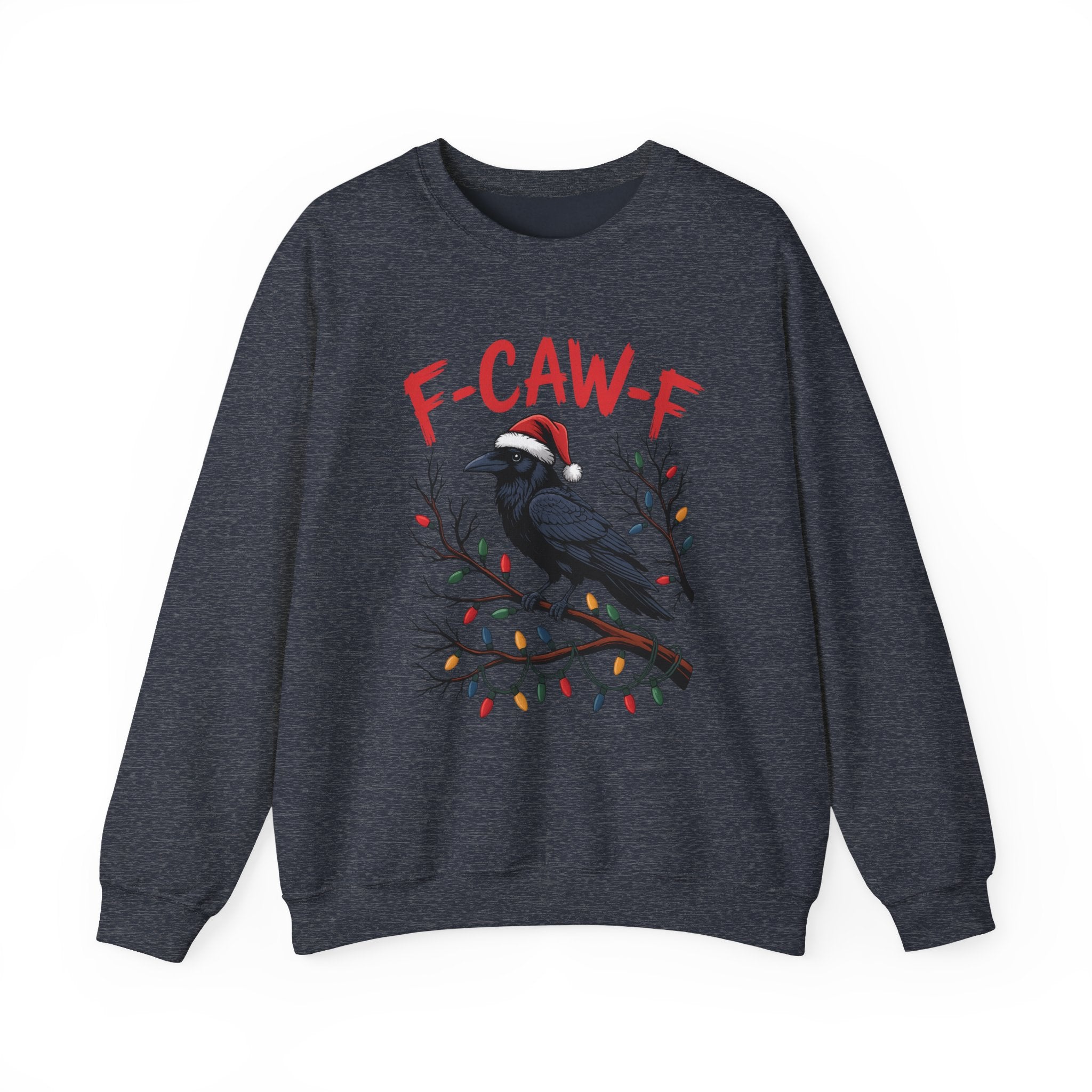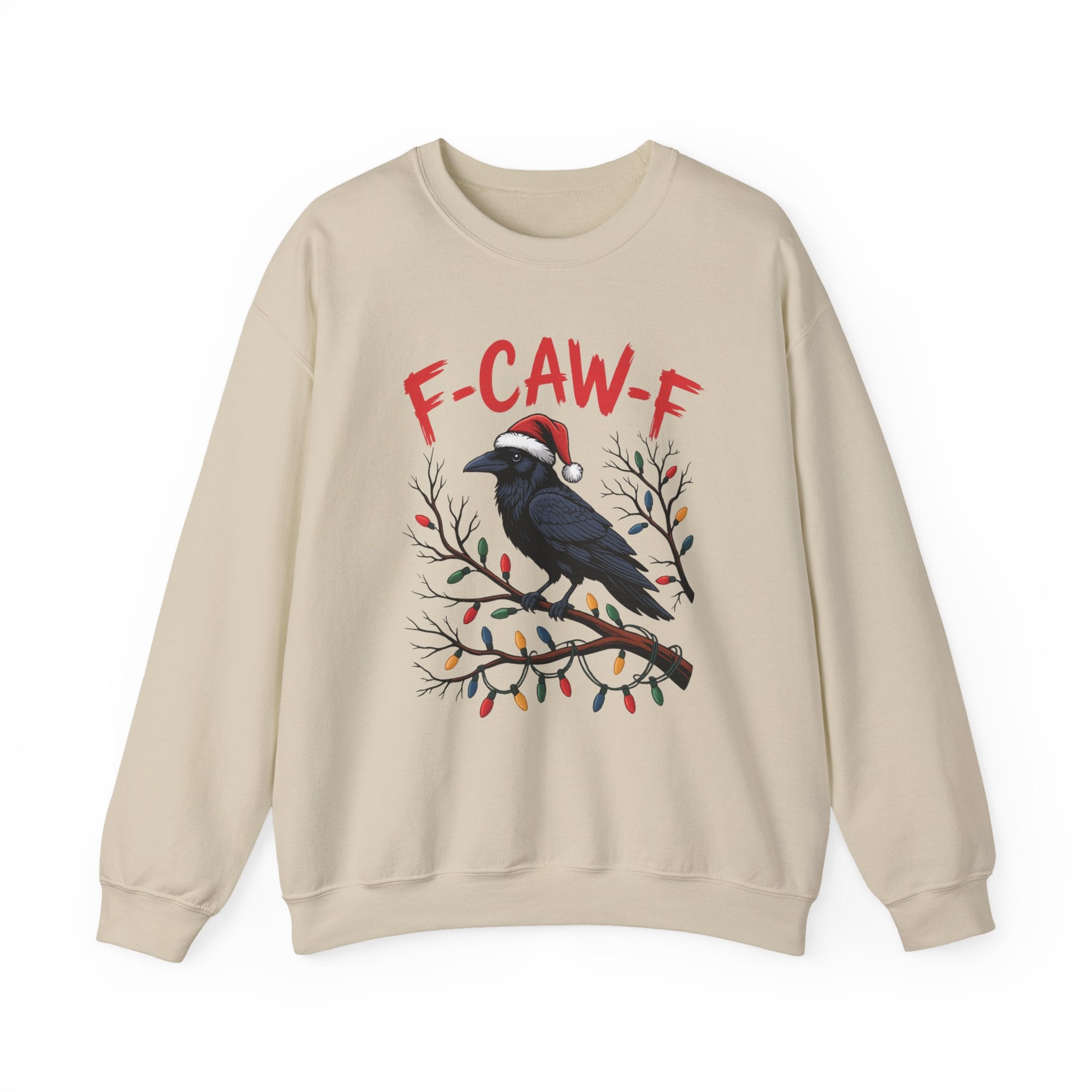 A cozy crewneck sweatshirt with playful, irreverent holiday spirit. A hand-drawn raven perches on a string of colorful lights, wearing a tiny Santa hat, while bold red lettering reads “F-CAW-F” above — a winking, bird-themed take on seasonal humor. The midweight cotton-poly blend and ribbed collar give it a lived-in, comfortable feel that layers easily for chilly evenings. It’s the kind of sweatshirt you reach for when you want to be warm, a little cheeky, and true to a nature-loving, slightly sarcastic sense of humor.