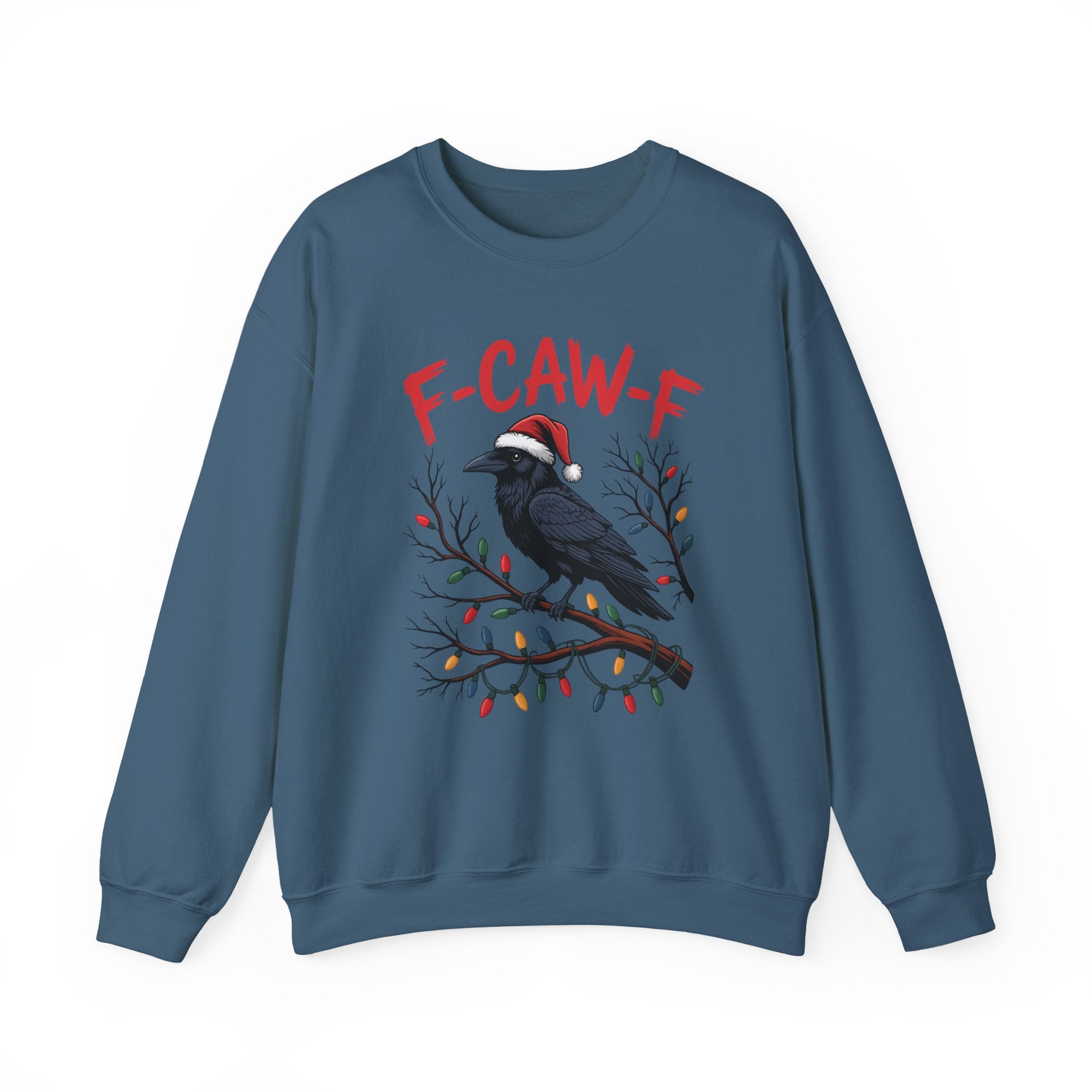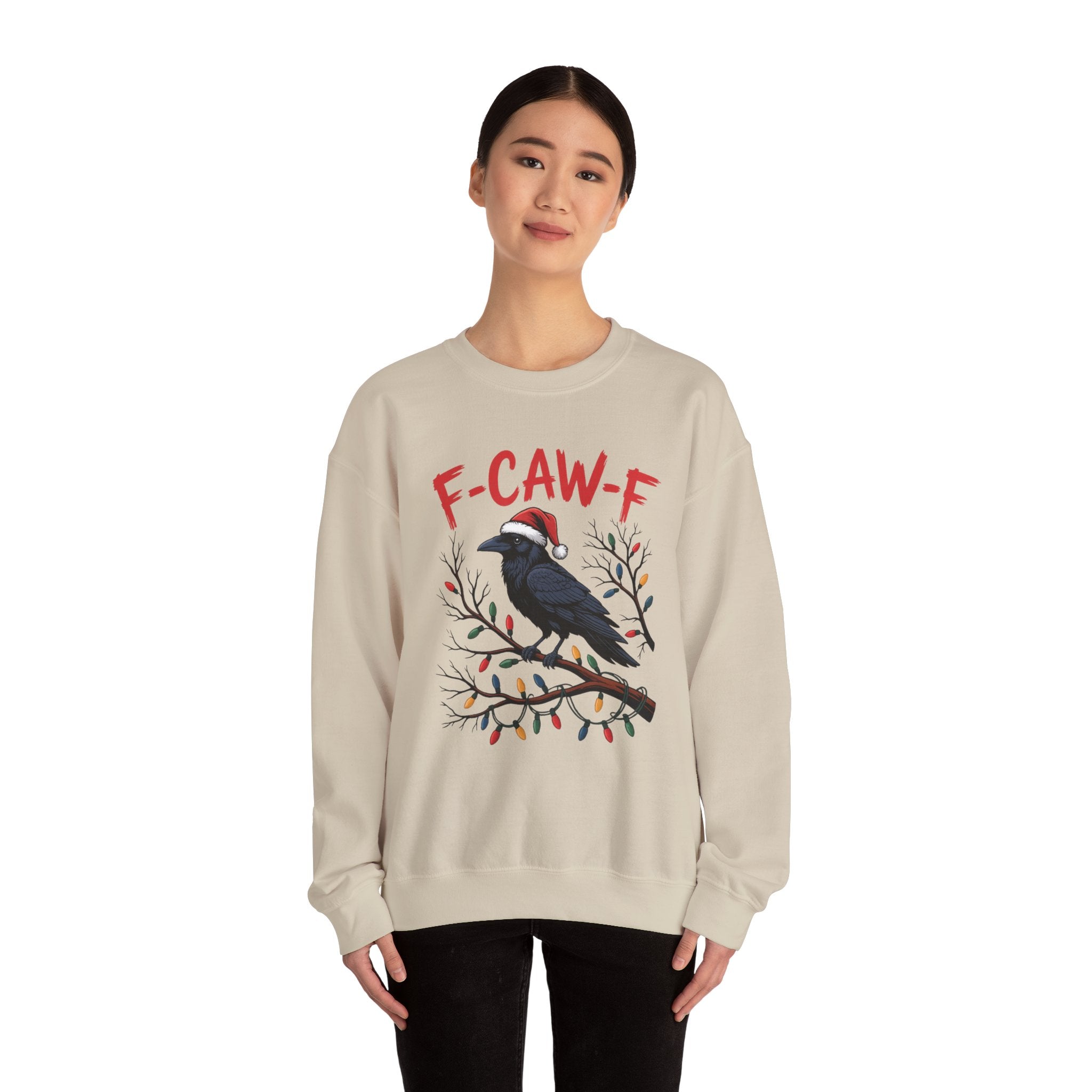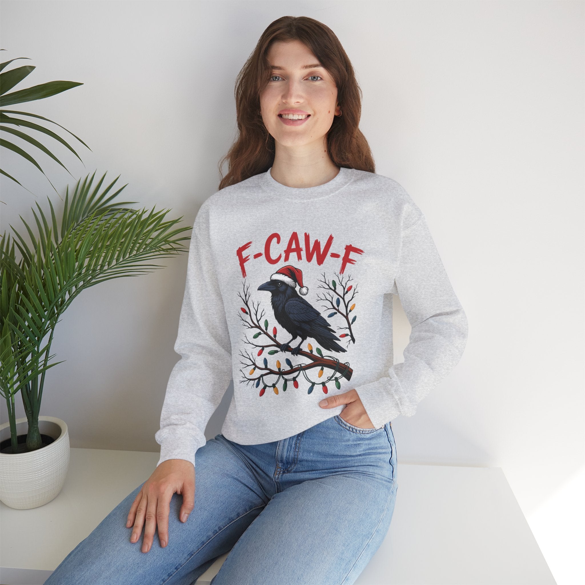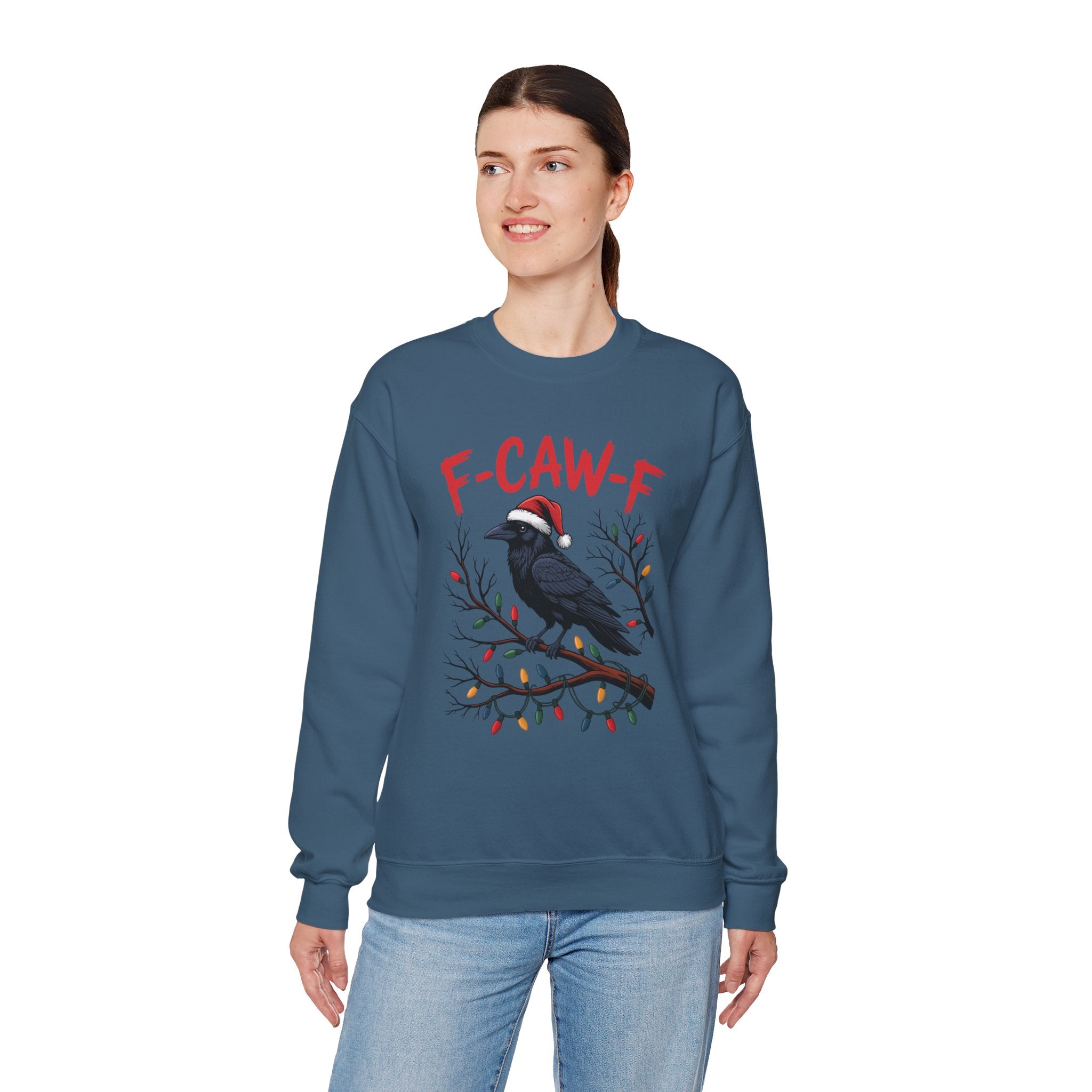 A cozy crewneck sweatshirt with playful, irreverent holiday spirit. A hand-drawn raven perches on a string of colorful lights, wearing a tiny Santa hat, while bold red lettering reads “F-CAW-F” above — a winking, bird-themed take on seasonal humor. The midweight cotton-poly blend and ribbed collar give it a lived-in, comfortable feel that layers easily for chilly evenings. It’s the kind of sweatshirt you reach for when you want to be warm, a little cheeky, and true to a nature-loving, slightly sarcastic sense of humor.