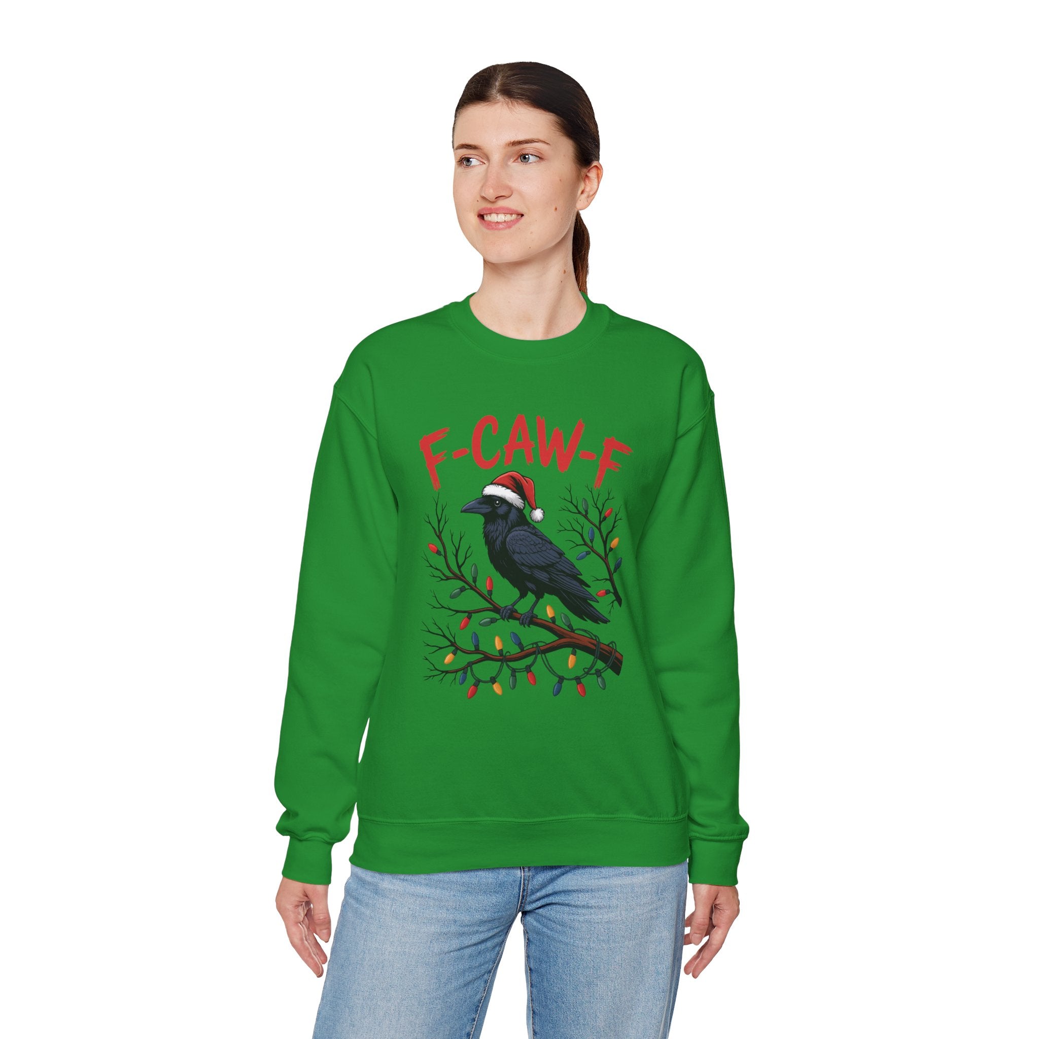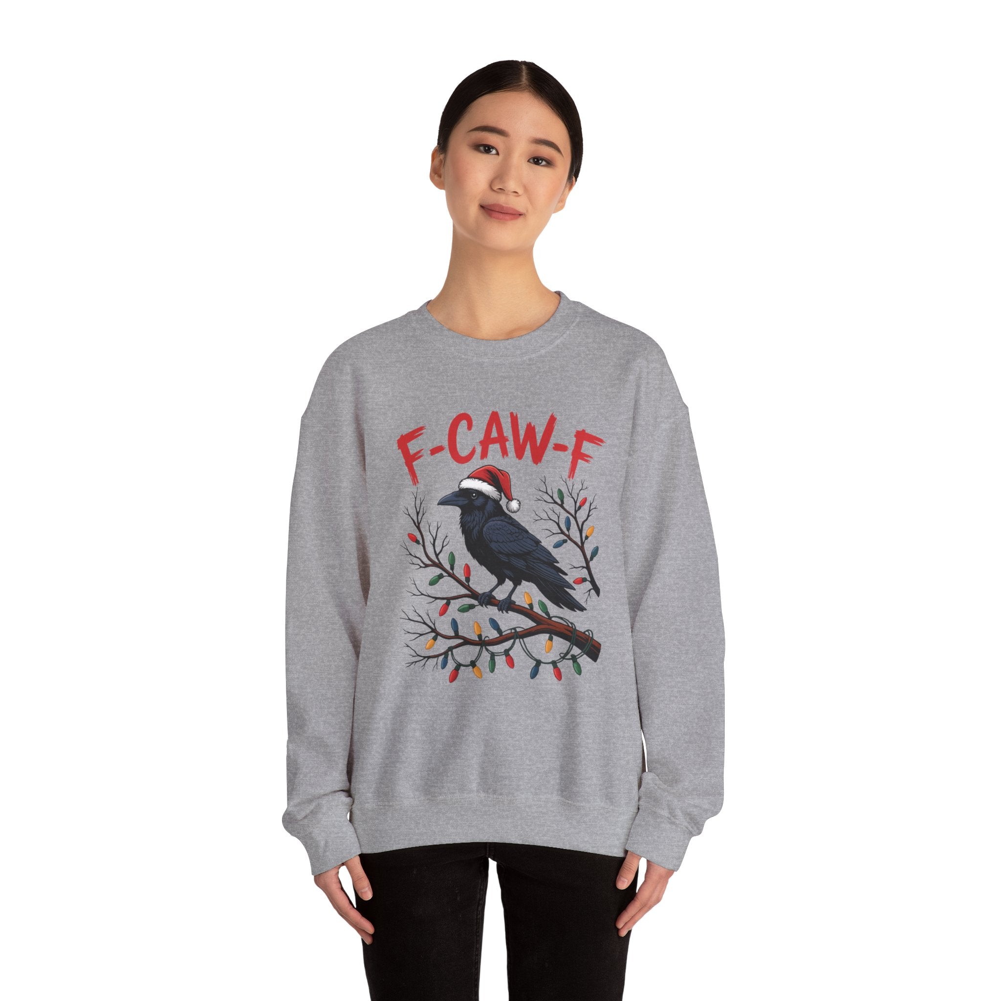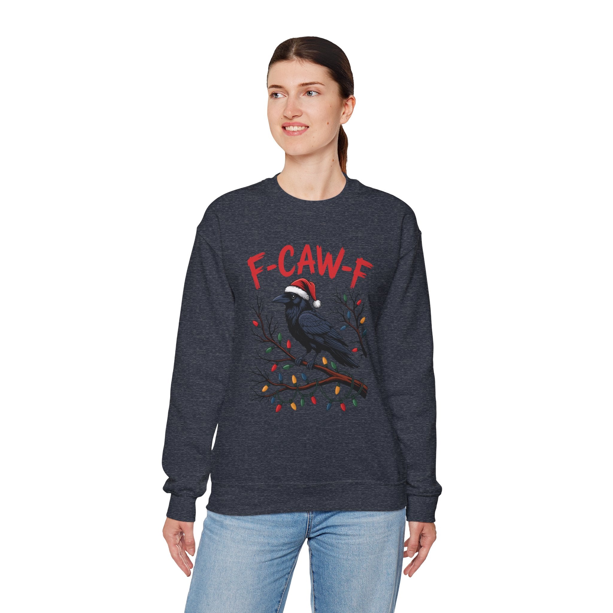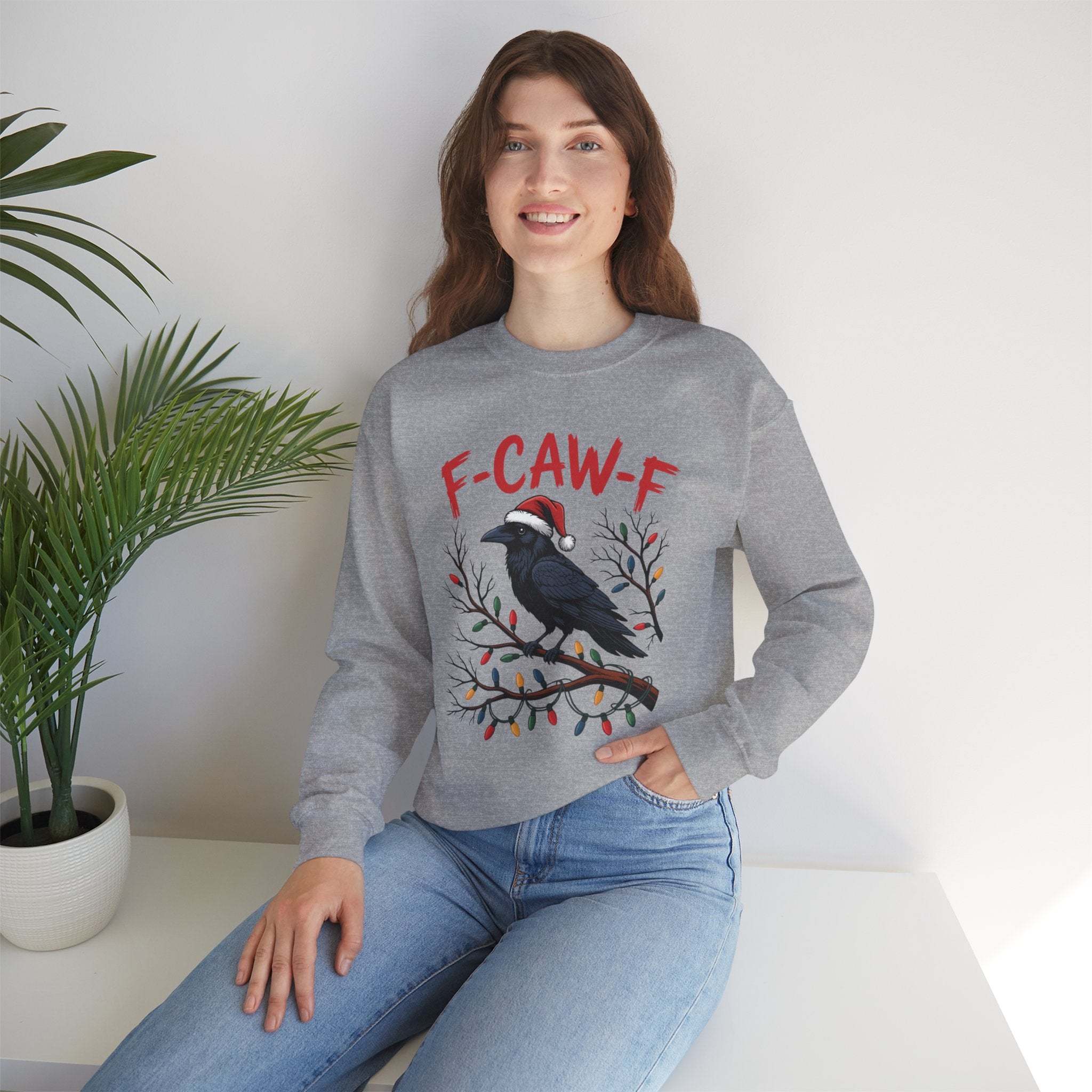 A cozy crewneck sweatshirt with playful, irreverent holiday spirit. A hand-drawn raven perches on a string of colorful lights, wearing a tiny Santa hat, while bold red lettering reads “F-CAW-F” above — a winking, bird-themed take on seasonal humor. The midweight cotton-poly blend and ribbed collar give it a lived-in, comfortable feel that layers easily for chilly evenings. It’s the kind of sweatshirt you reach for when you want to be warm, a little cheeky, and true to a nature-loving, slightly sarcastic sense of humor.