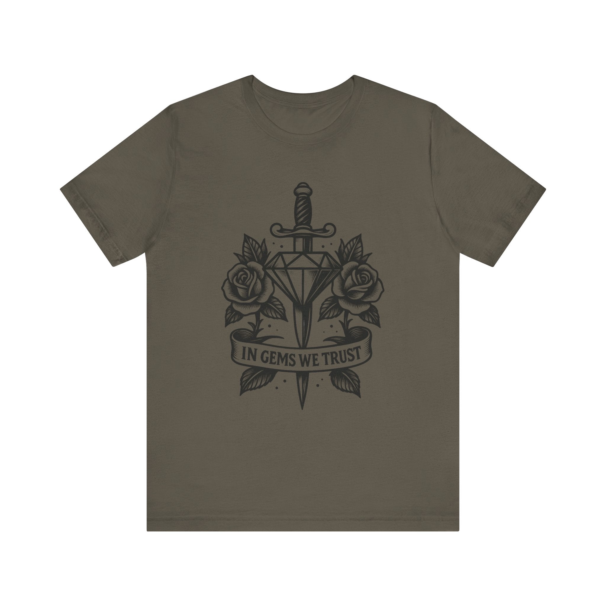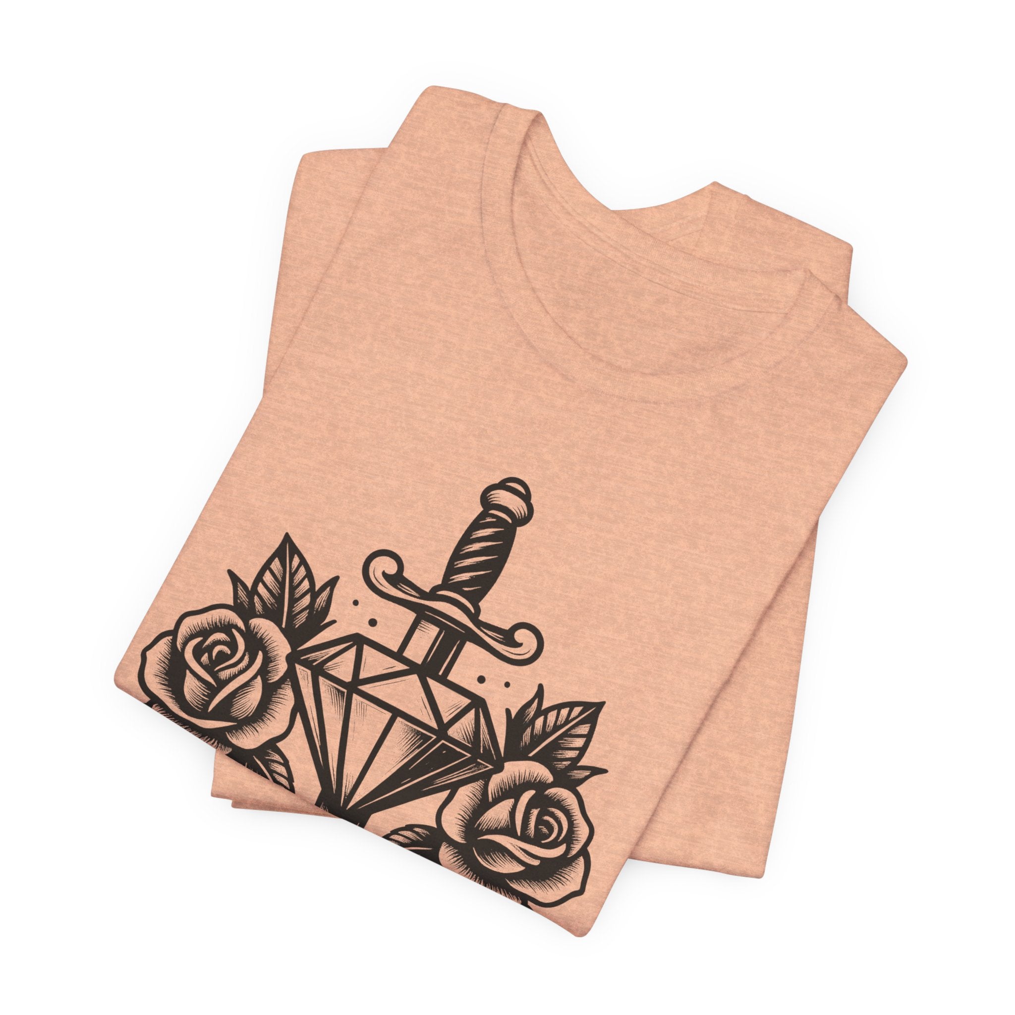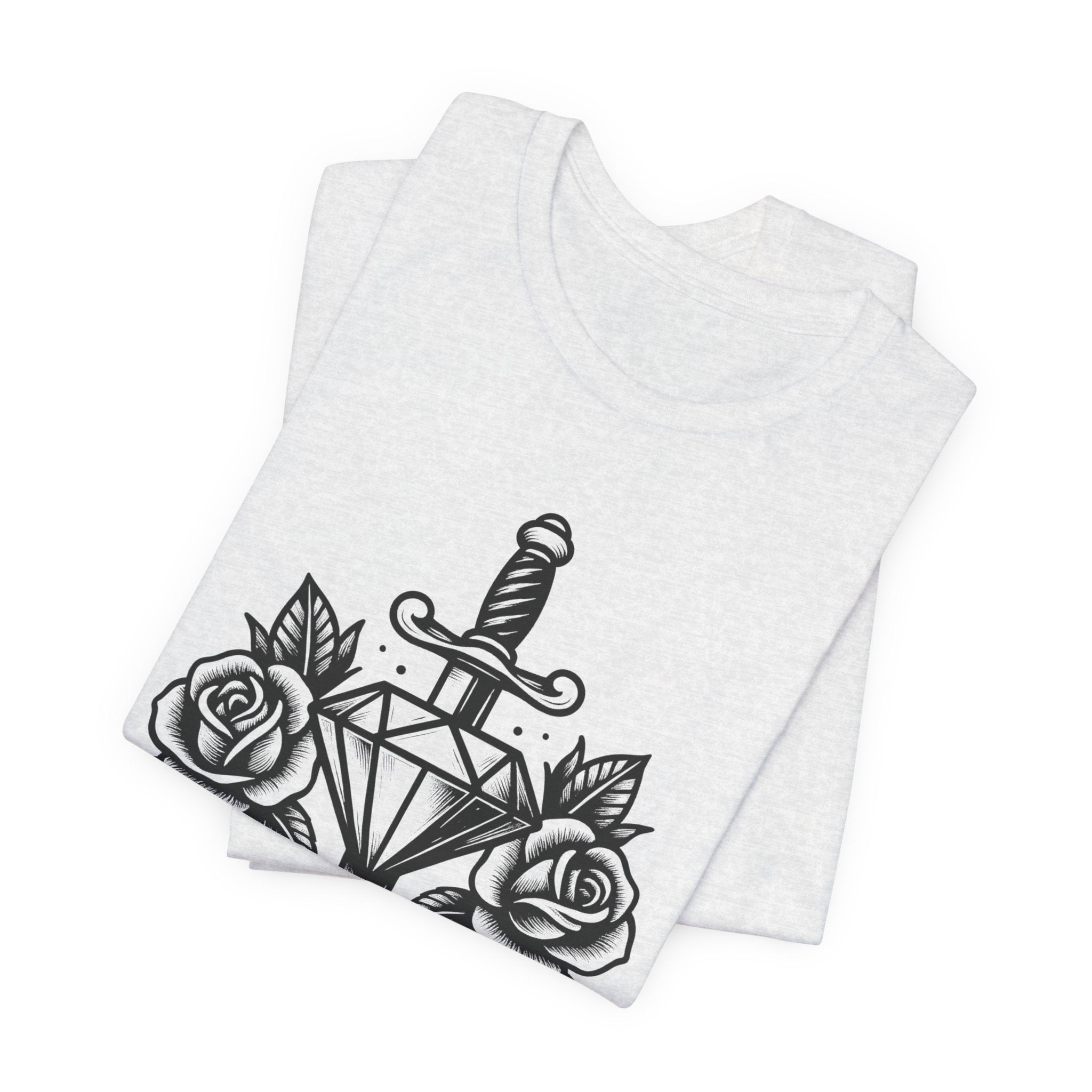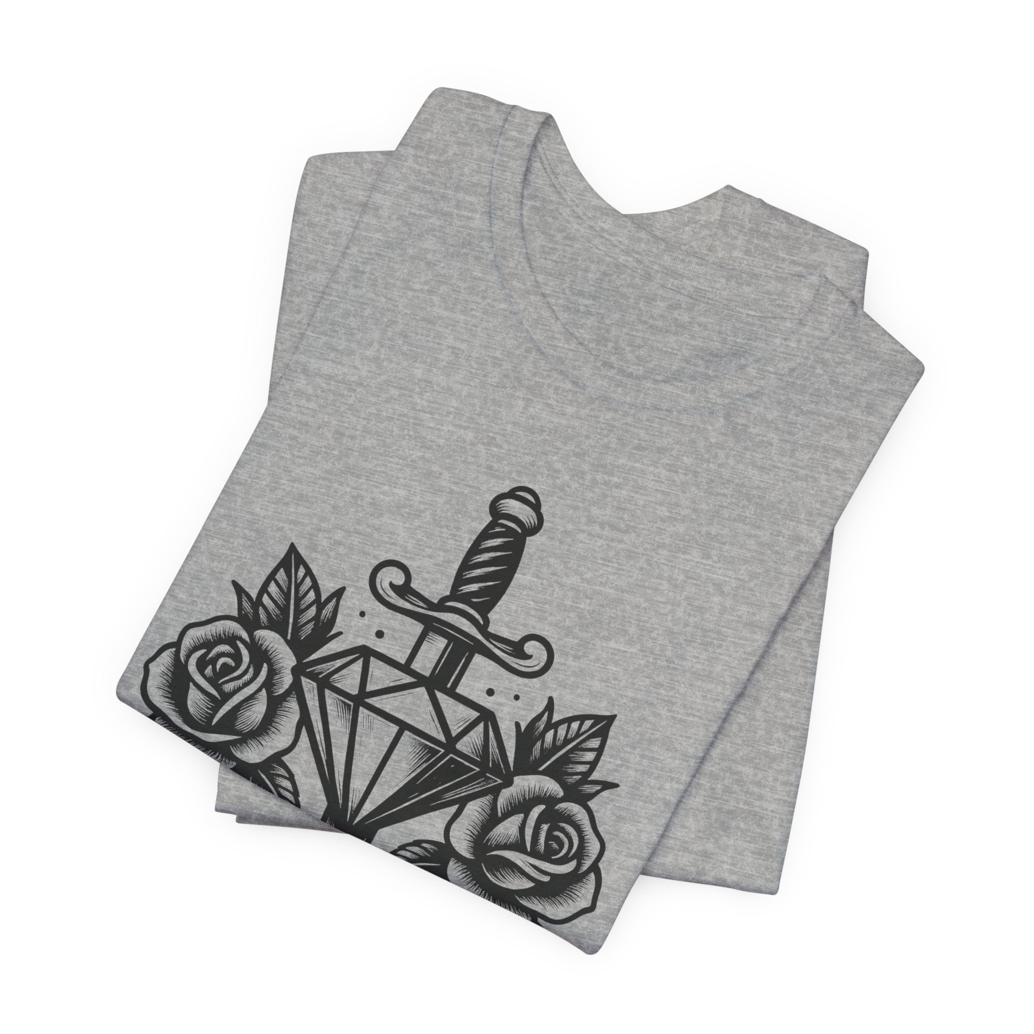 Introducing a stylish Unisex Jersey Short Sleeve Tee, perfect for those who appreciate artful expression and casual comfort. Featuring a striking design that combines roses and a dagger, this tee embodies a blend of elegance and boldness. Ideal for creative souls and individuals who love to make a statement. The lightweight, breathable fabric makes it perfect for everyday wear, while its relaxed fit keeps you comfortable on any occasion. Whether you’re hanging out with friends, attending a music festival, or just enjoying a day at home, this tee fits into your lifestyle seamlessly. It’s a fantastic gift for birthdays, holidays, and celebrations for those who love unique and artsy apparel.