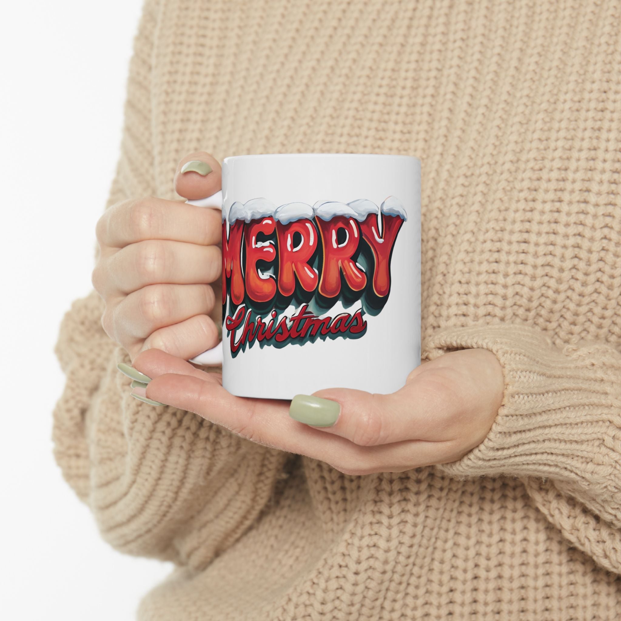 A glossy ceramic mug that brings playful holiday cheer to every sip. Bold, candy-like lettering dusted with snowy highlights wraps around the white surface, giving a retro festive vibe that sparks smiles at morning coffee or an evening cocoa. Lightweight yet sturdy, it feels familiar in hand thanks to the comfortable C-handle and bright, high-resolution print that resists fading. Use it during cozy nights by twinkling lights, at family gatherings, or as a cheerful pick-me-up on quiet winter mornings — this mug adds a warm, nostalgic note to everyday rituals.