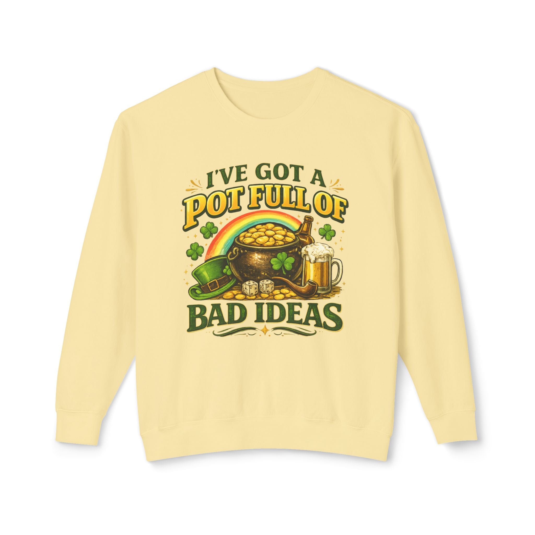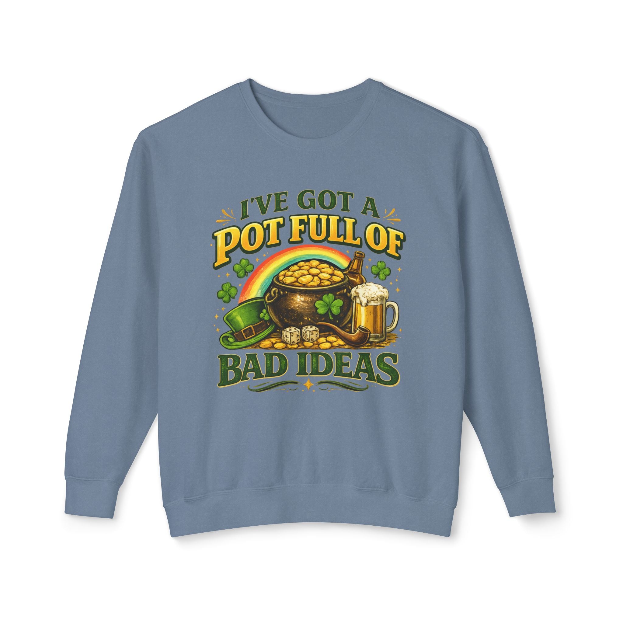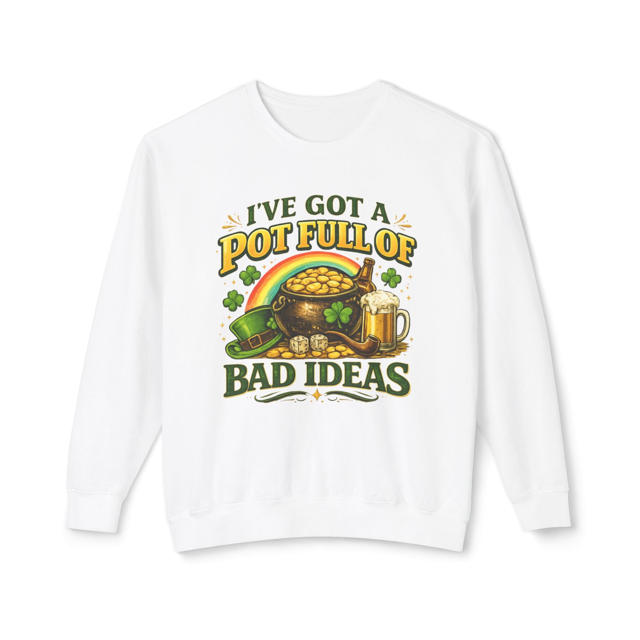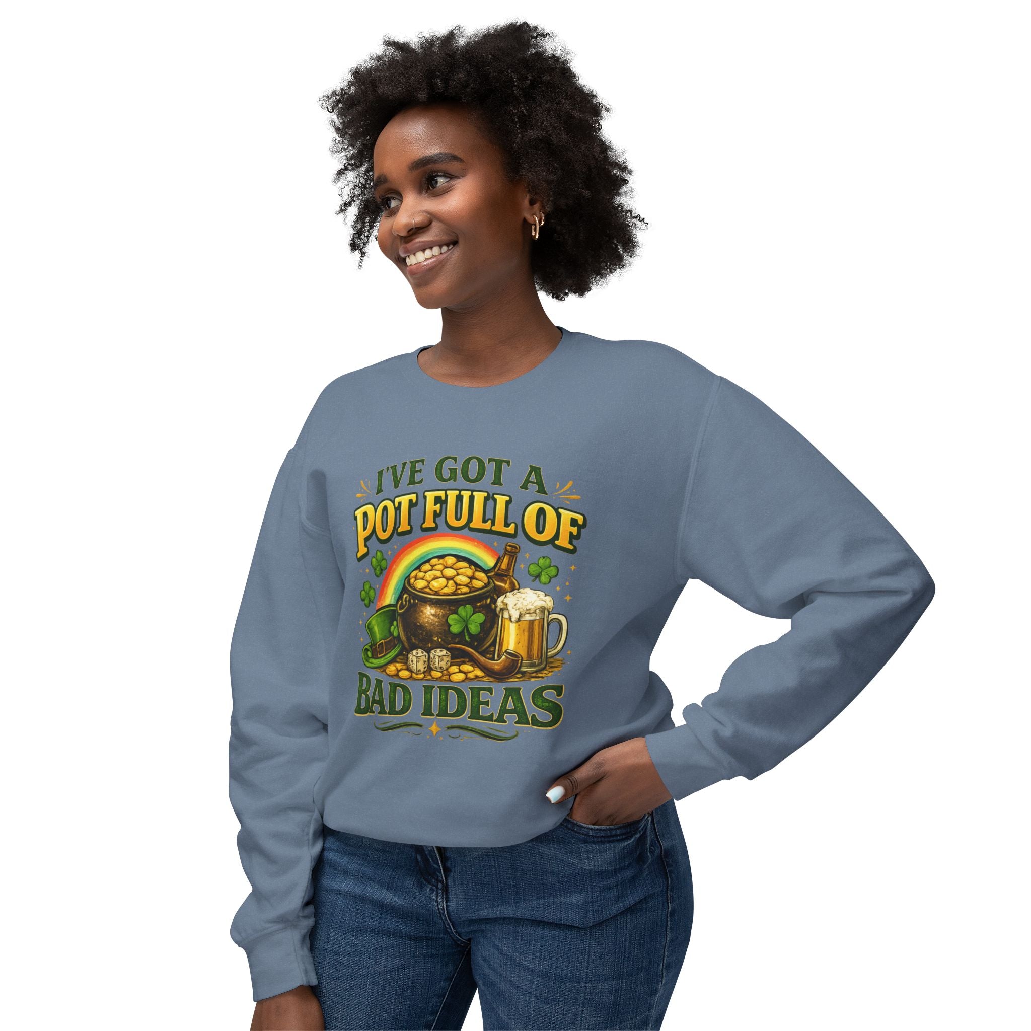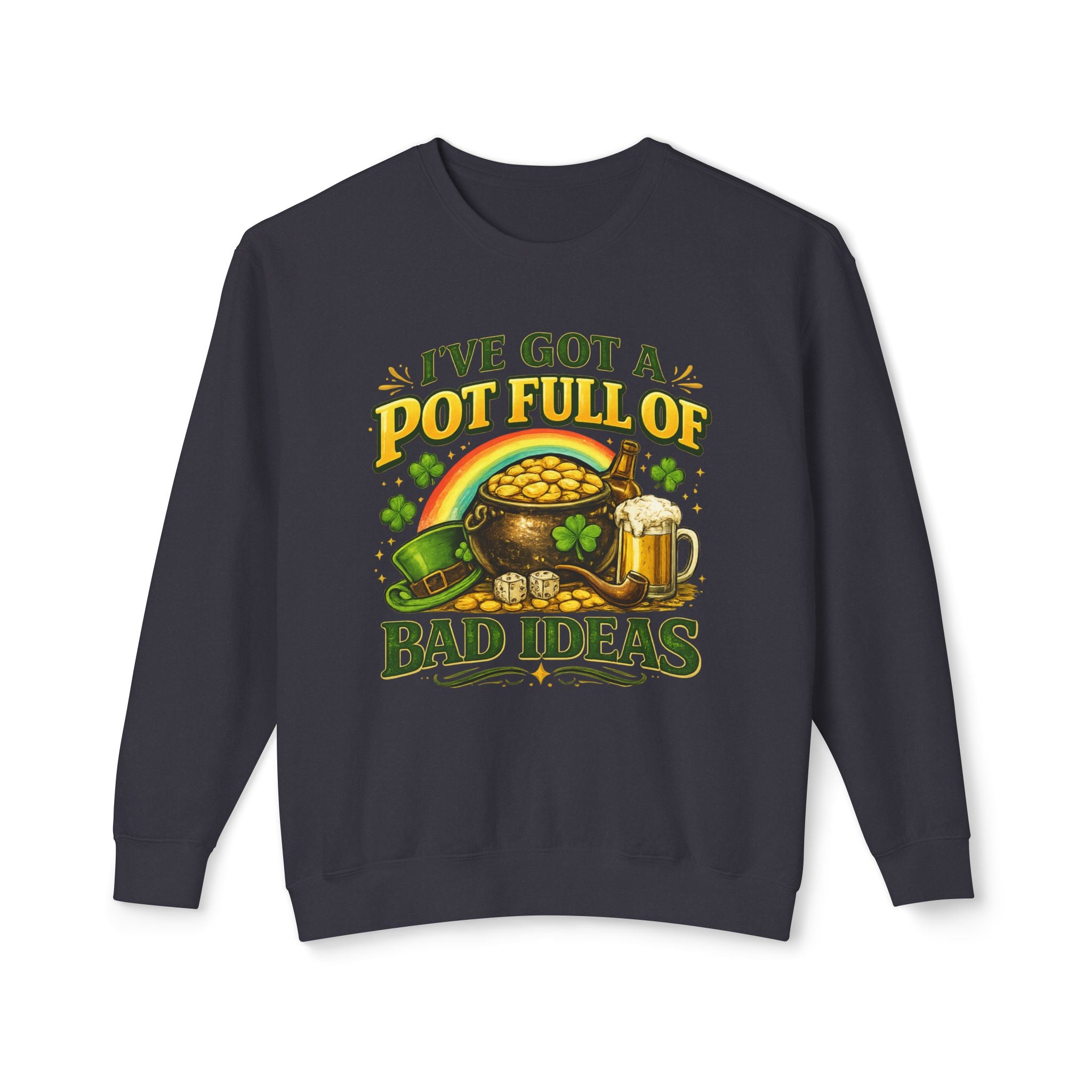 Soft, lightweight crewneck that wears like a cozy laugh. This relaxed-fit sweatshirt carries a playful St. Patrick’s Day vibe — a pot of gold, shamrocks, and a frothy mug illustrated in warm, vintage tones with the cheeky line “I’ve got a pot full of bad ideas.” It sits comfortably over jeans or layered under a jacket, catching smiles at pub nights, parades, or casual get-togethers. The breathable ring-spun cotton and tubular knit construction keep the silhouette clean and drape-ready, while ribbed cuffs and hem hold shape through repeat wear. Slip it on when you want to be comfortable, a little mischievous, and entirely yourself.